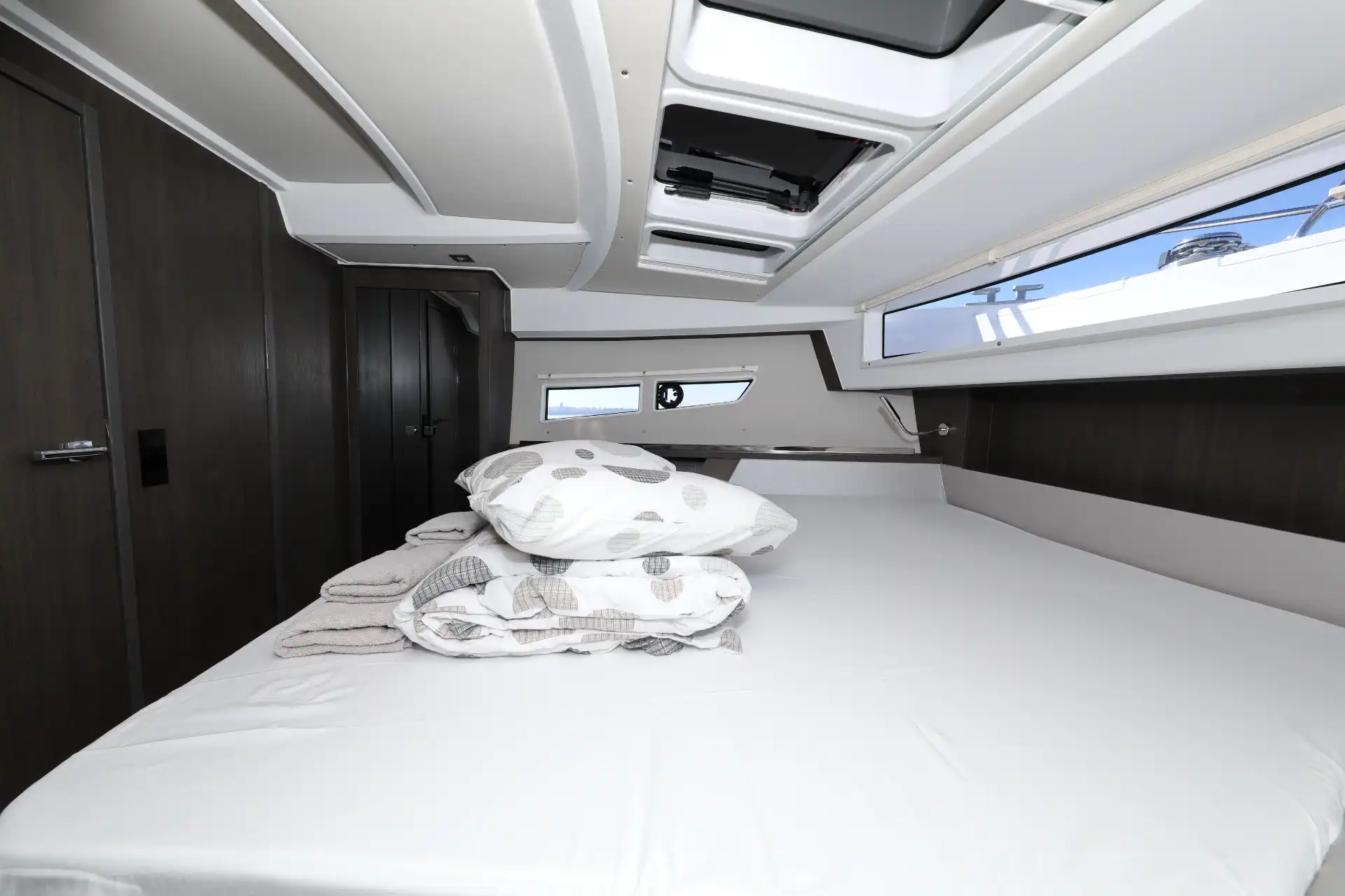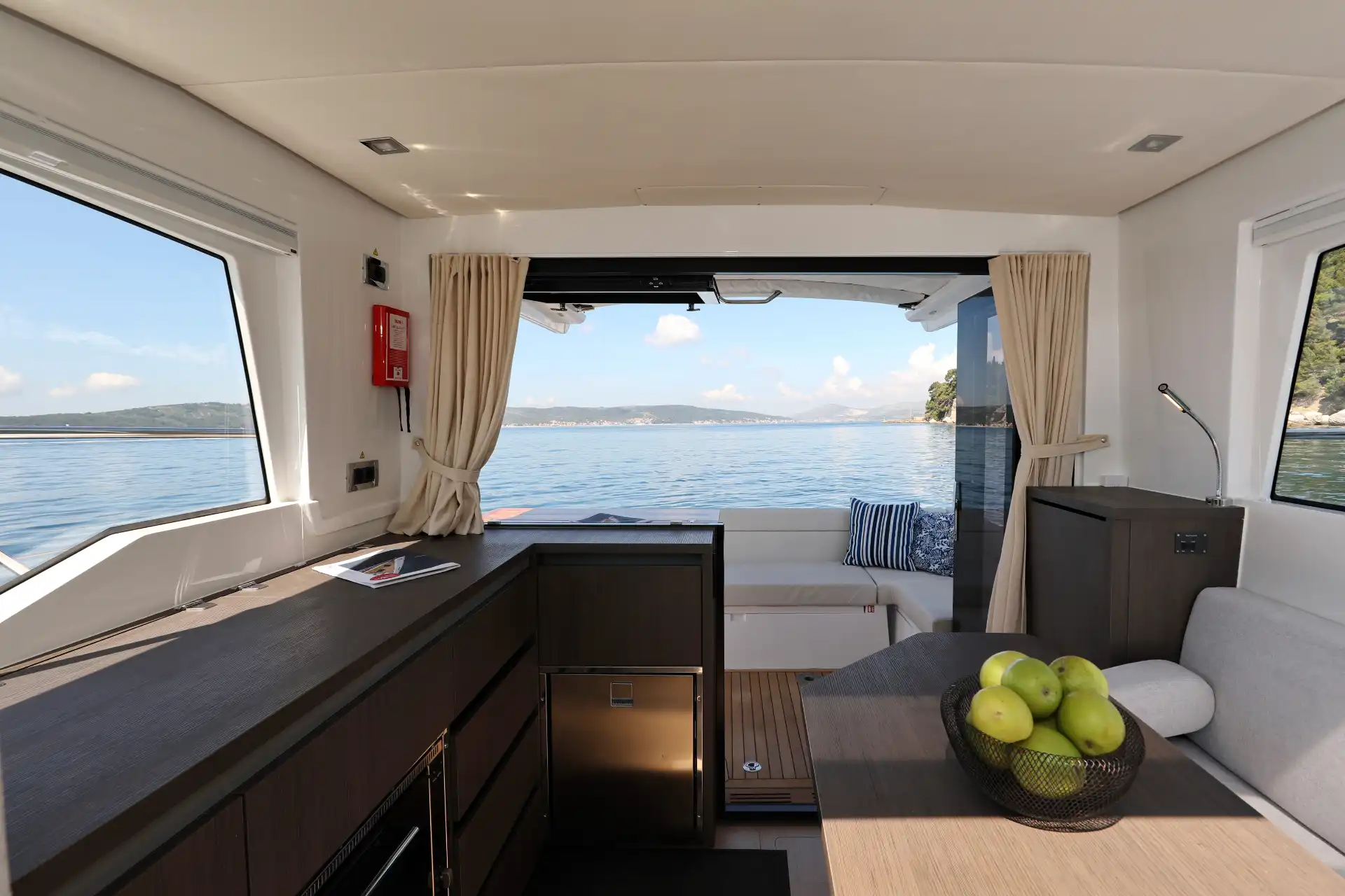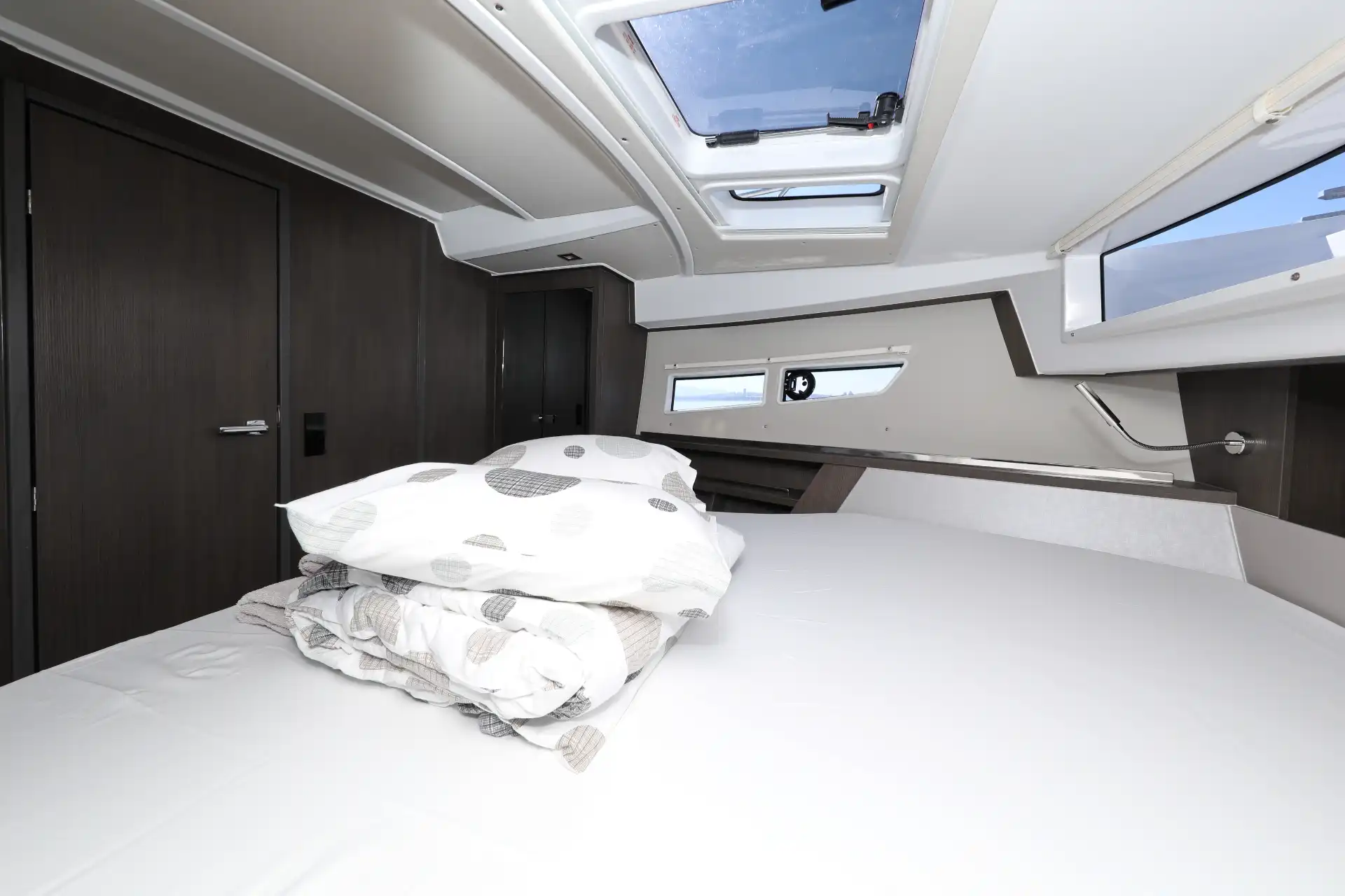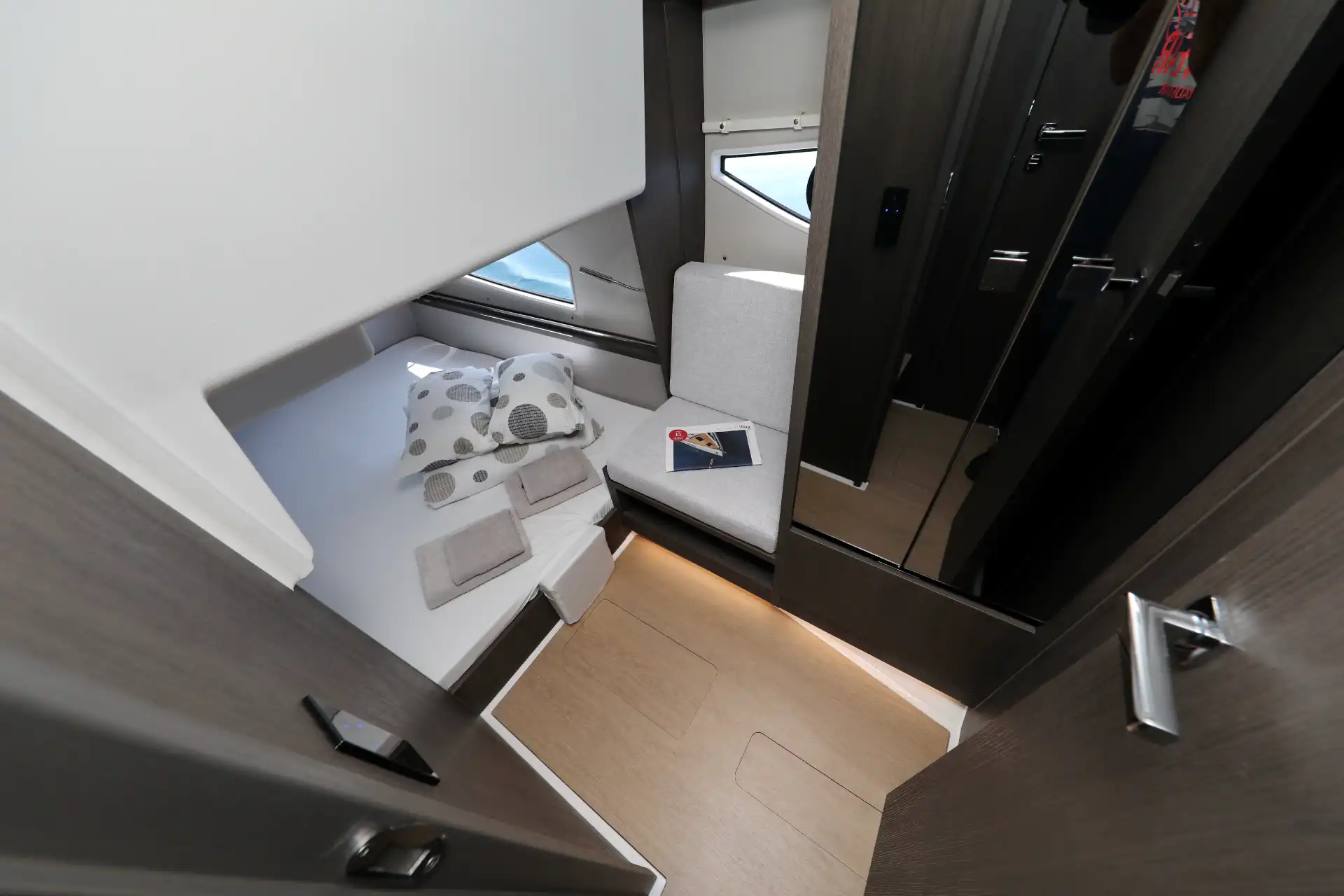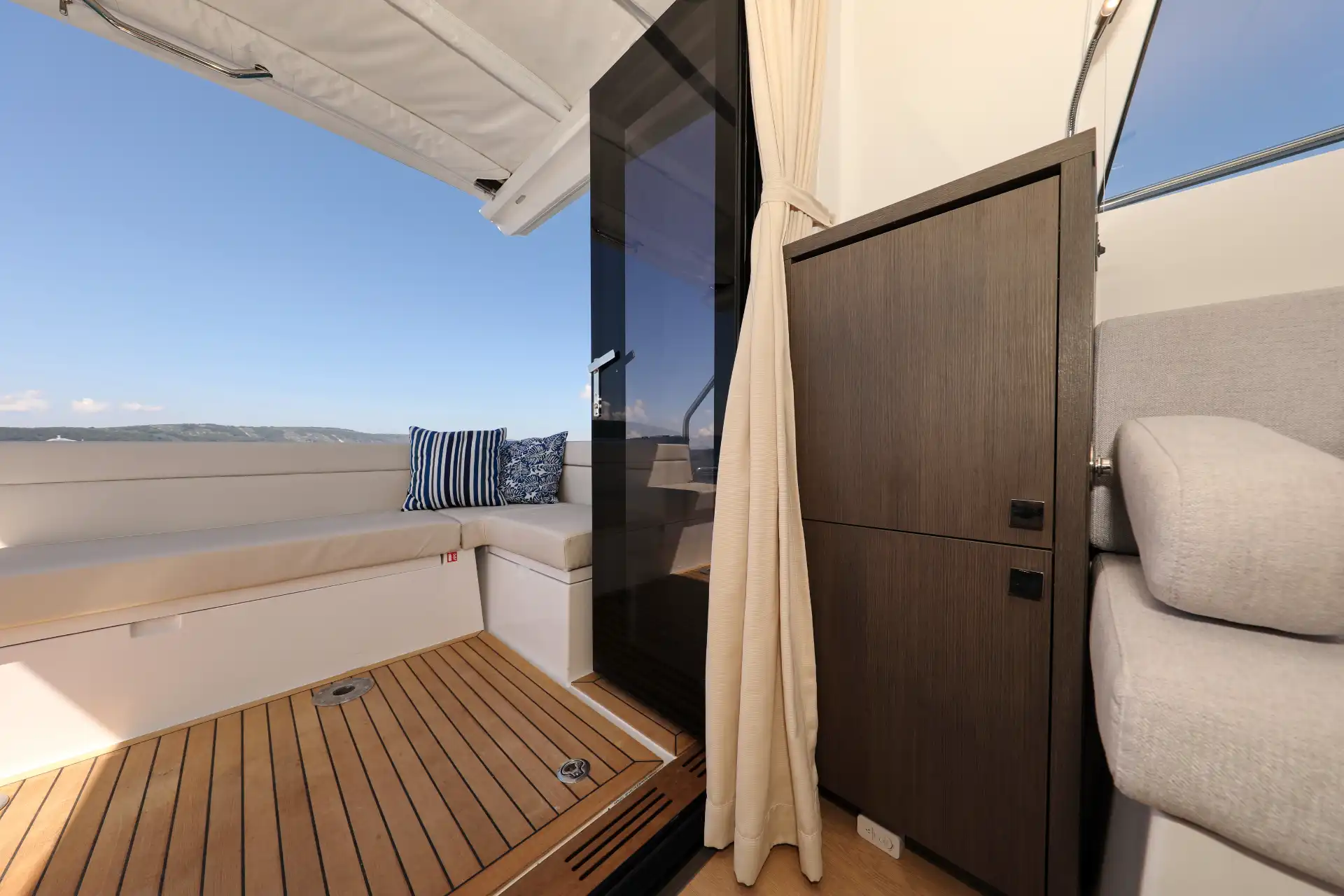 Innovative Lösungen, wie beispielsweise das große Fenster am Bug, setzen völlig neu Akzente, und schließlich und endlich gewinnt man durch den Wegfall der Innenbordmotoren enorm viel Stauraum unter Deck.