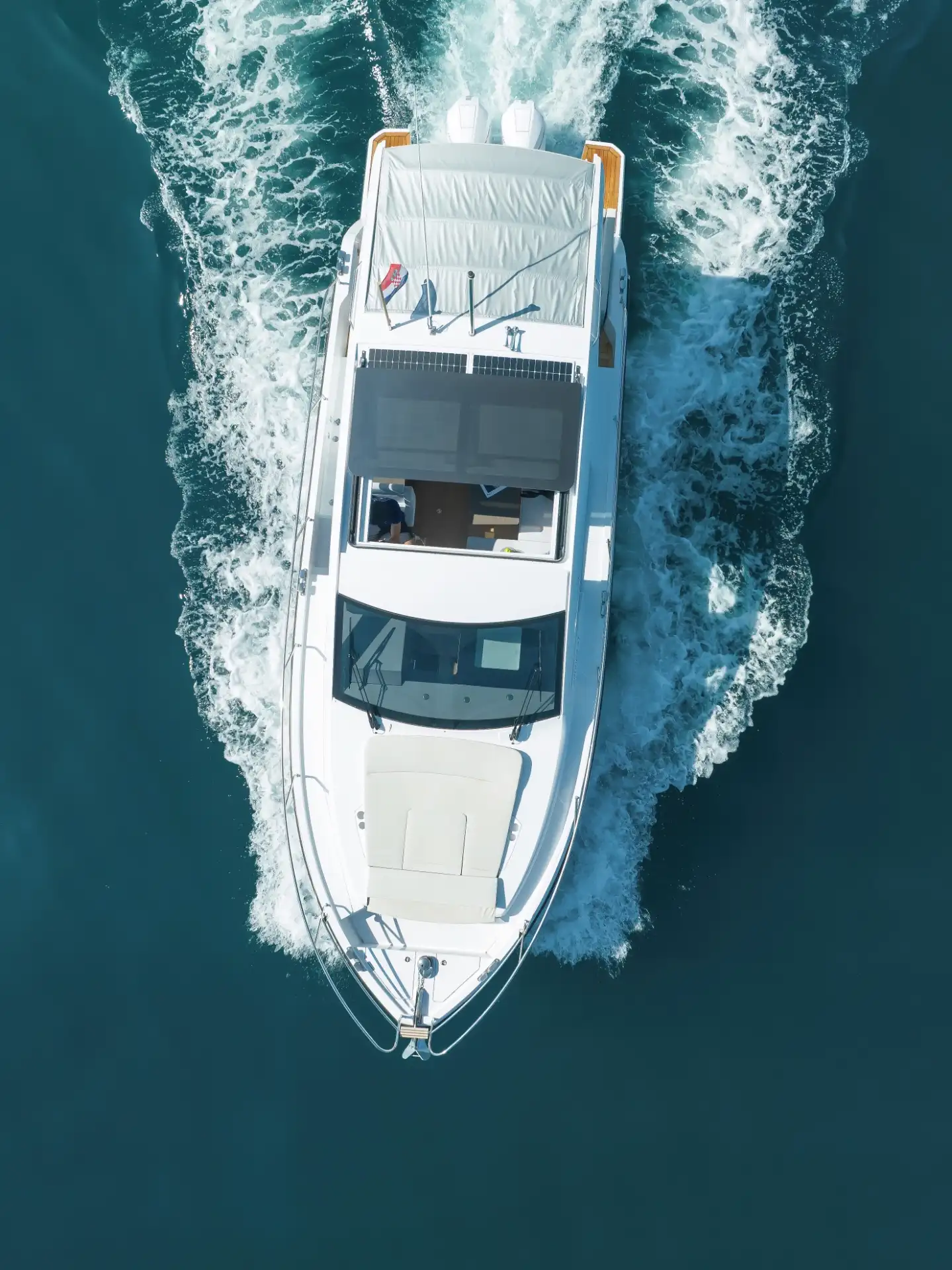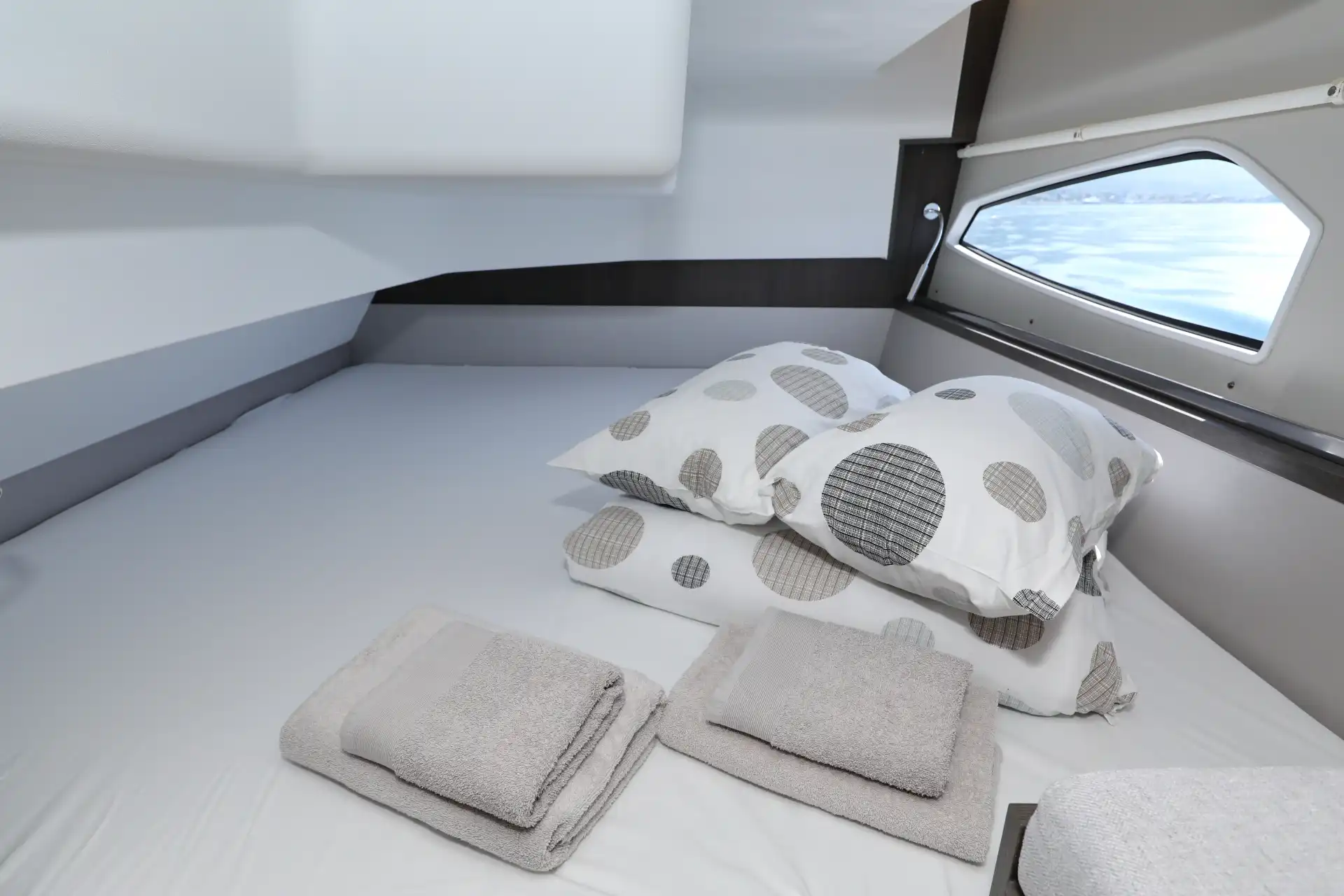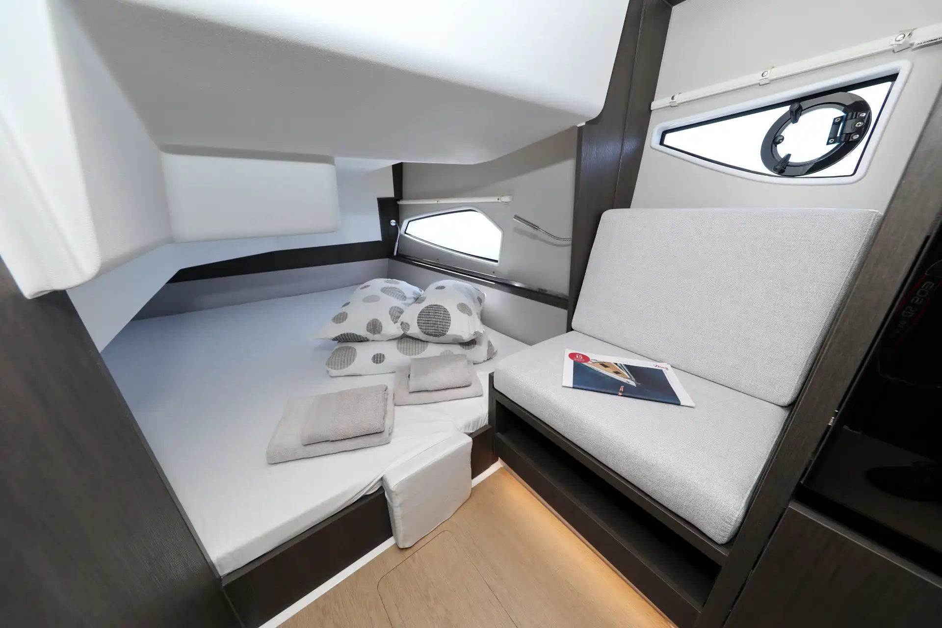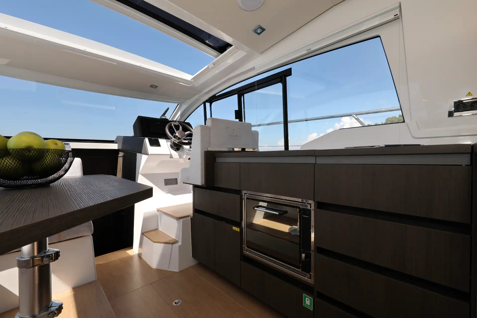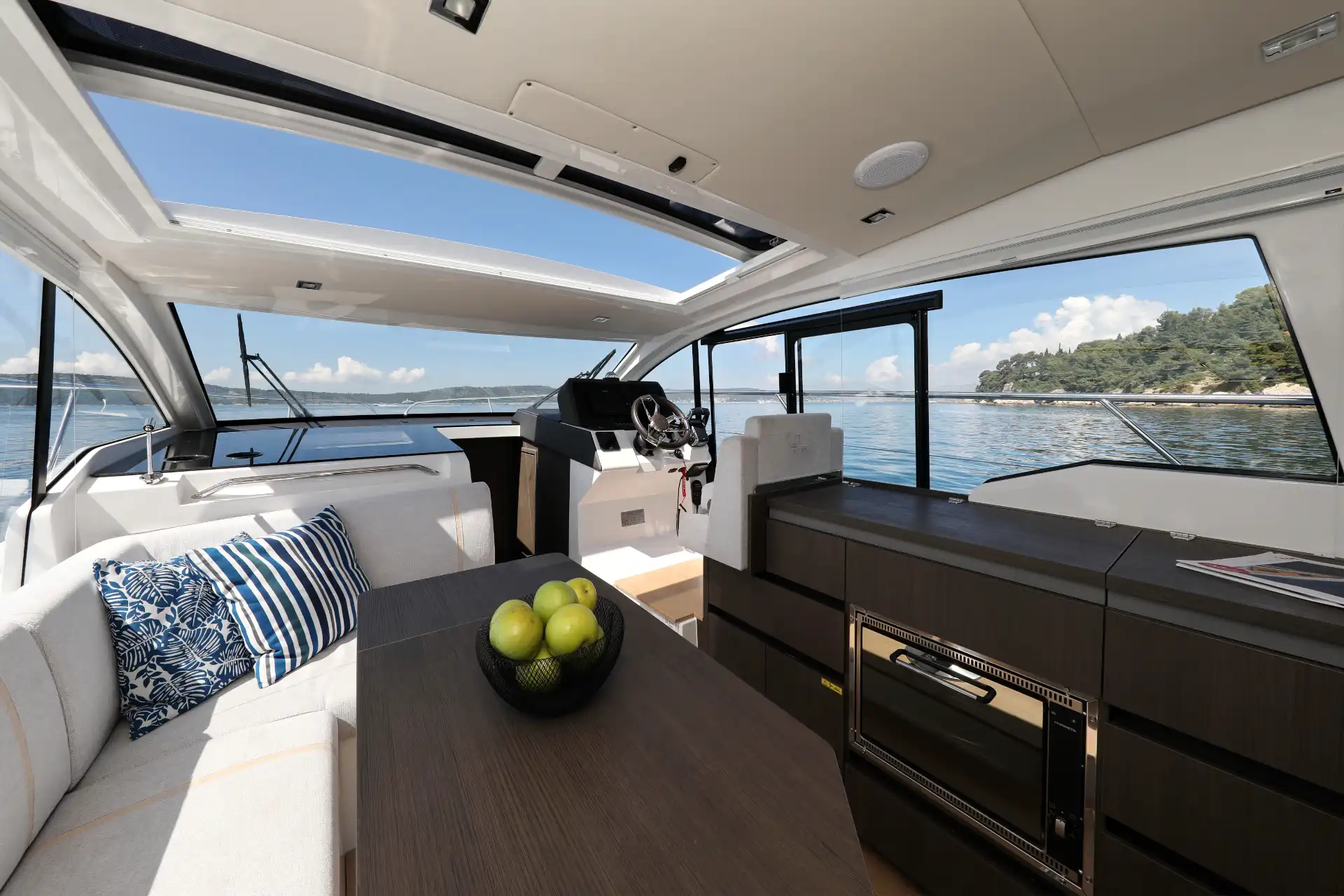 Innovative Lösungen, wie beispielsweise das große Fenster am Bug, setzen völlig neu Akzente, und schließlich und endlich gewinnt man durch den Wegfall der Innenbordmotoren enorm viel Stauraum unter Deck.