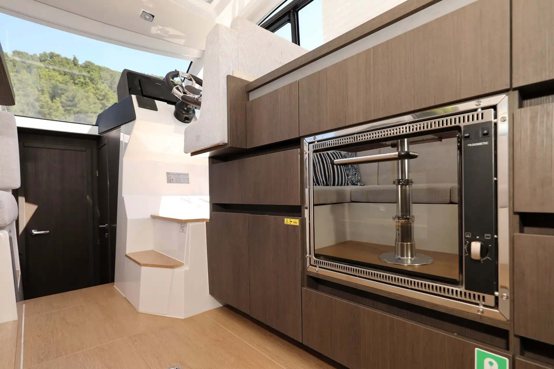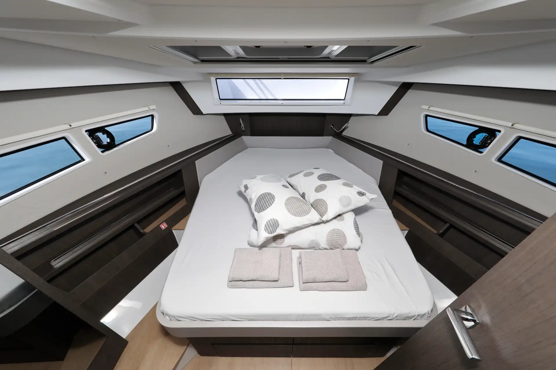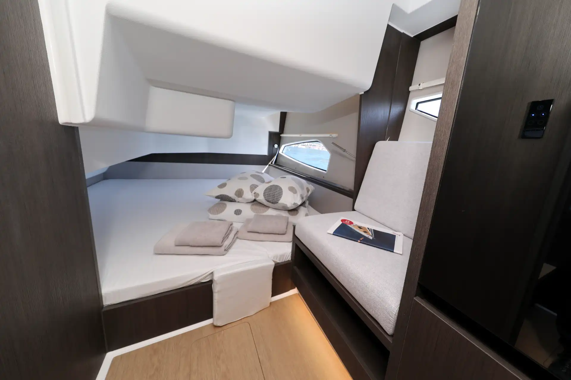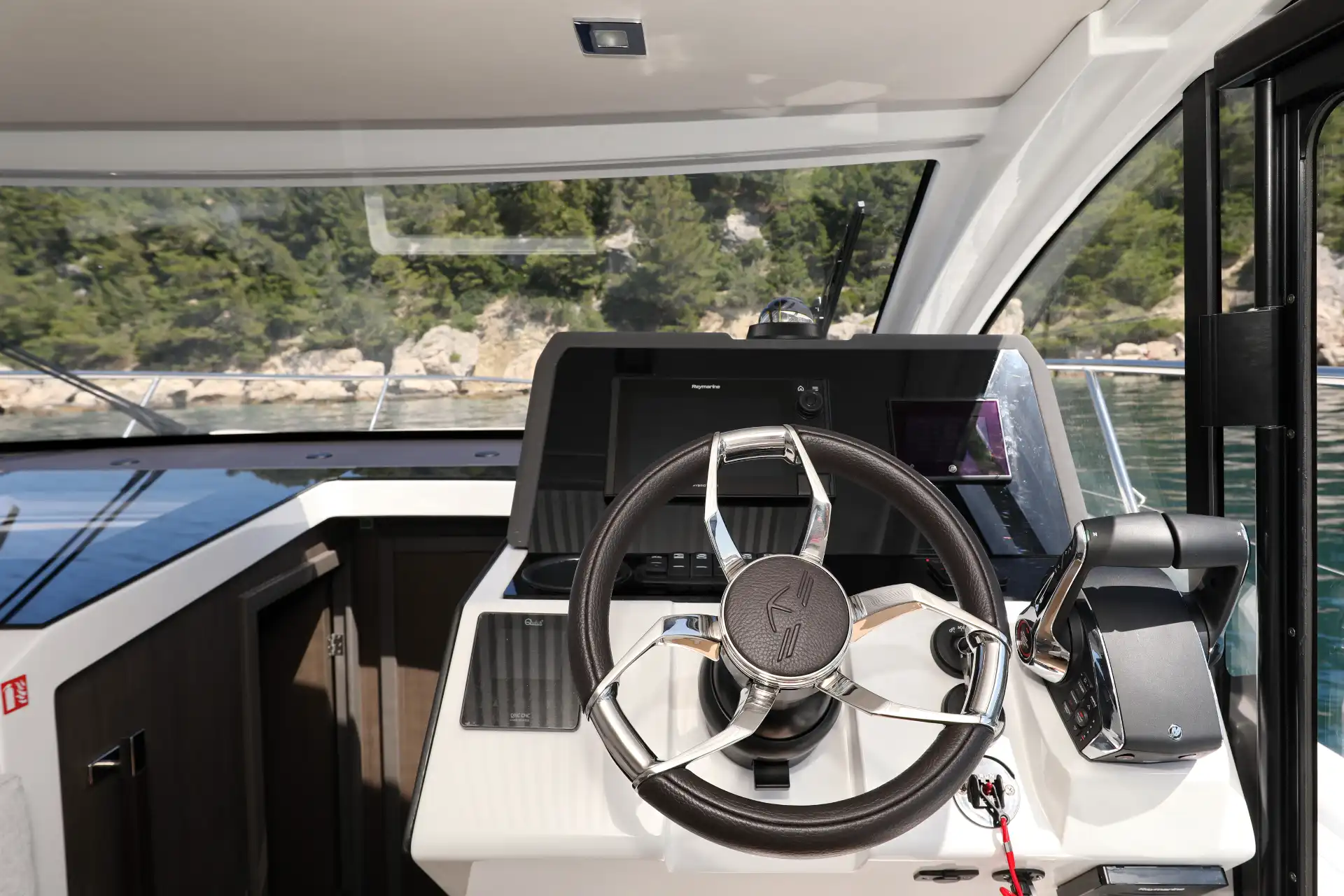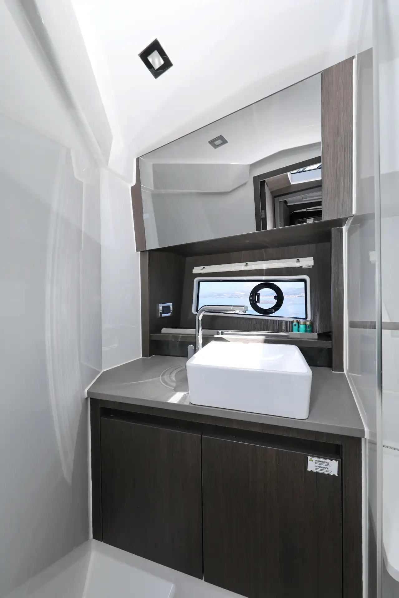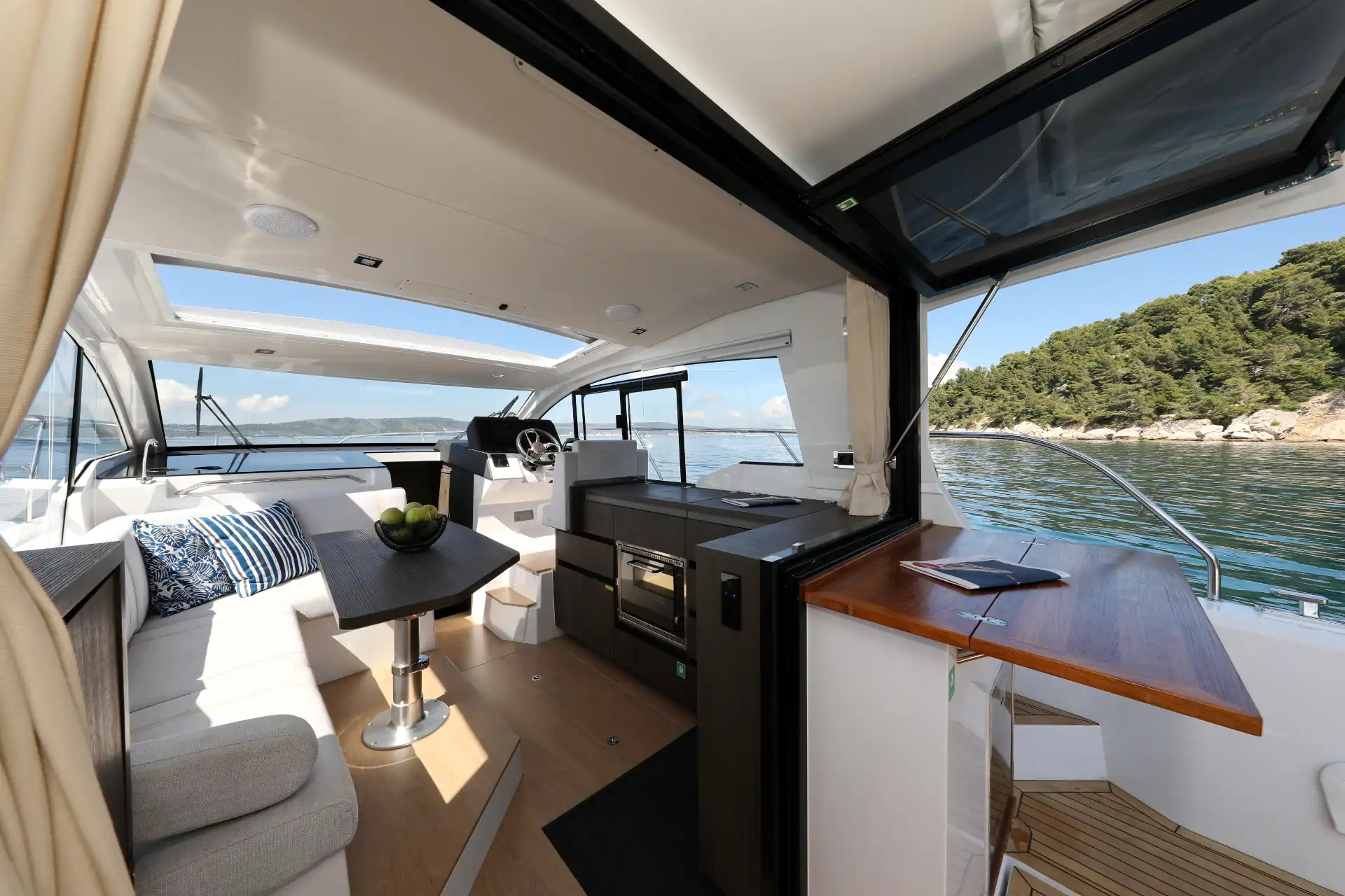 Innovative Lösungen, wie beispielsweise das große Fenster am Bug, setzen völlig neu Akzente, und schließlich und endlich gewinnt man durch den Wegfall der Innenbordmotoren enorm viel Stauraum unter Deck.