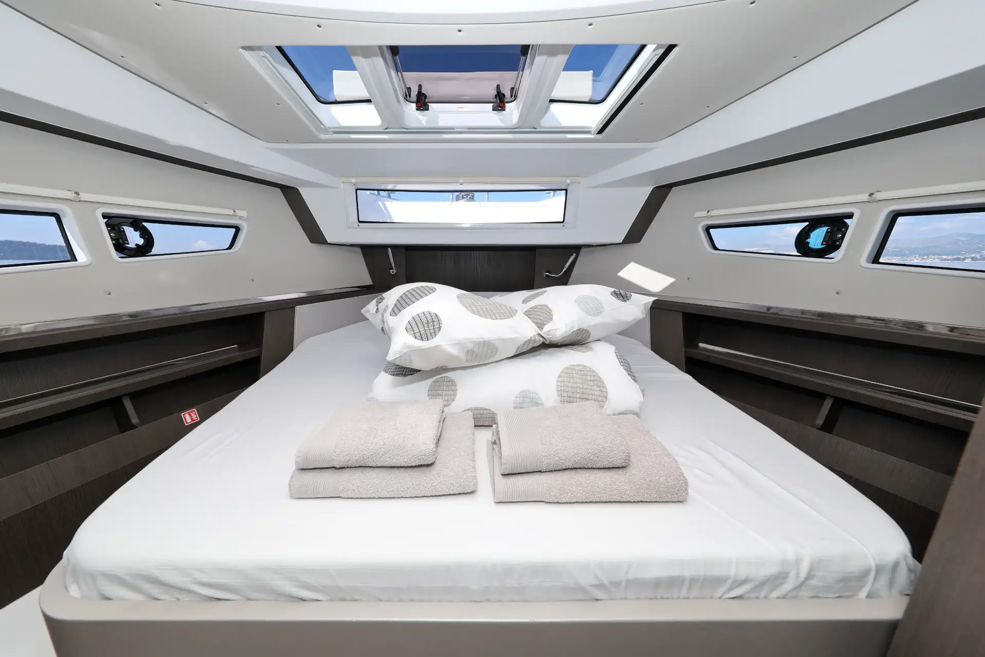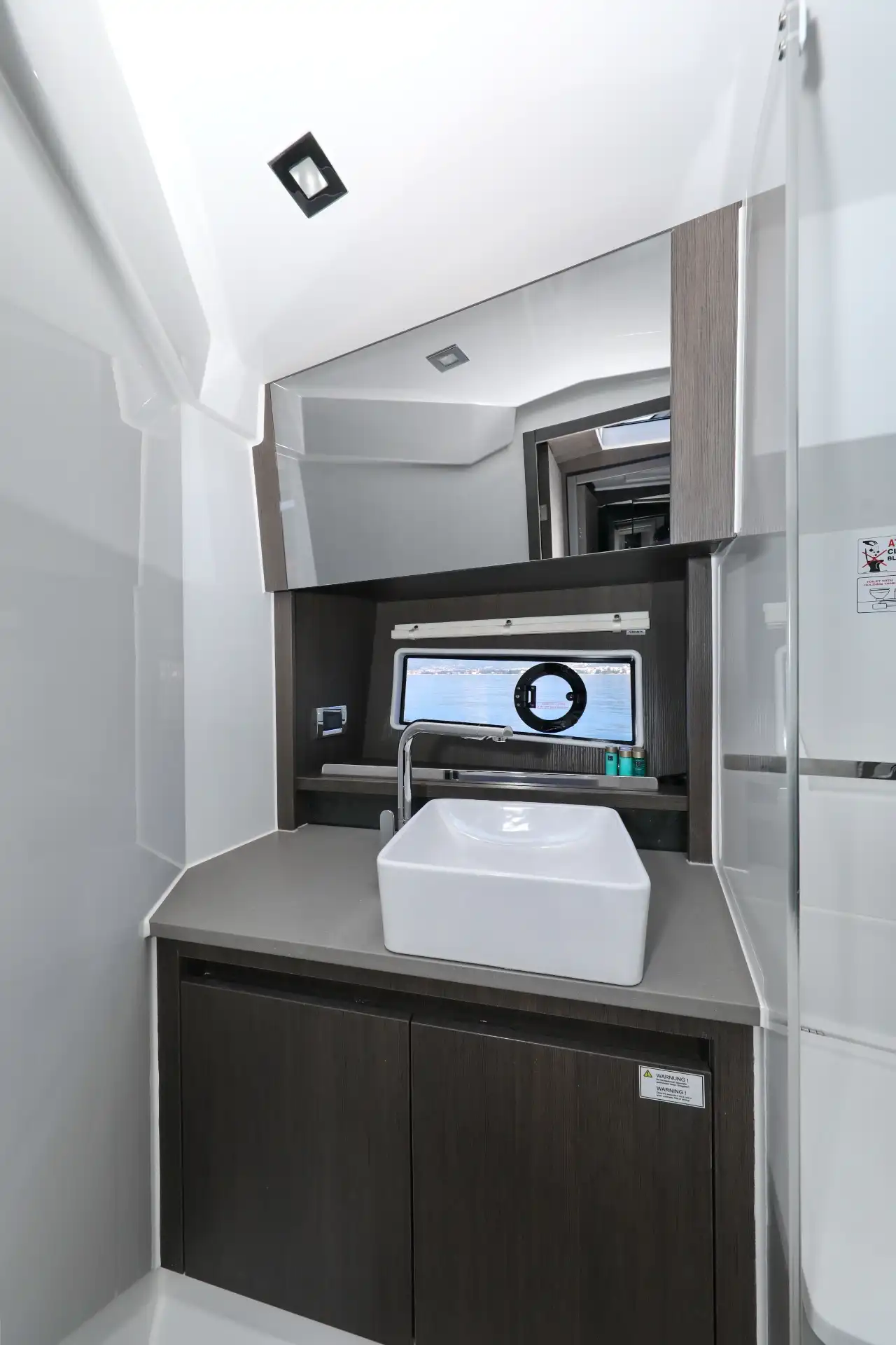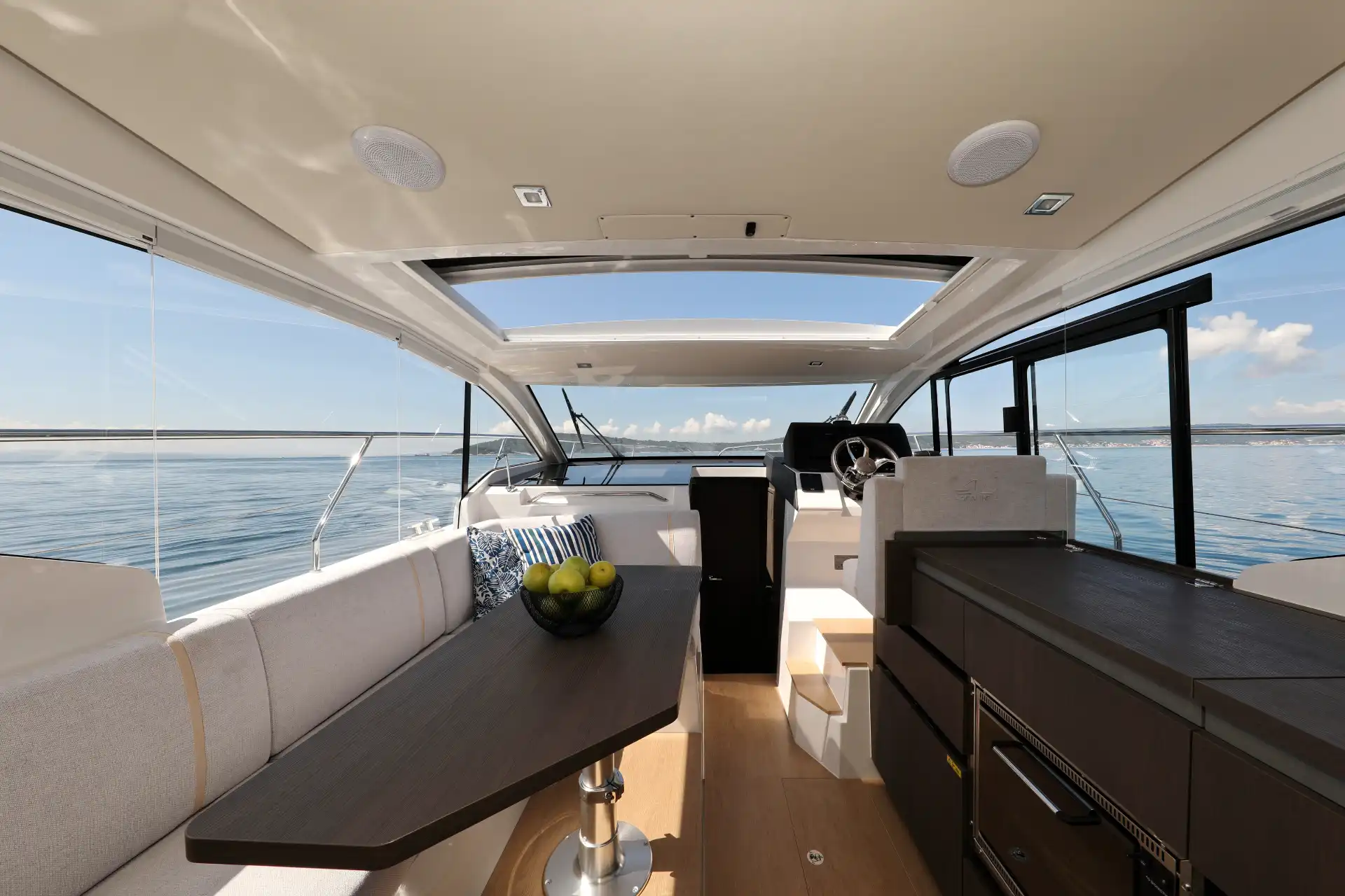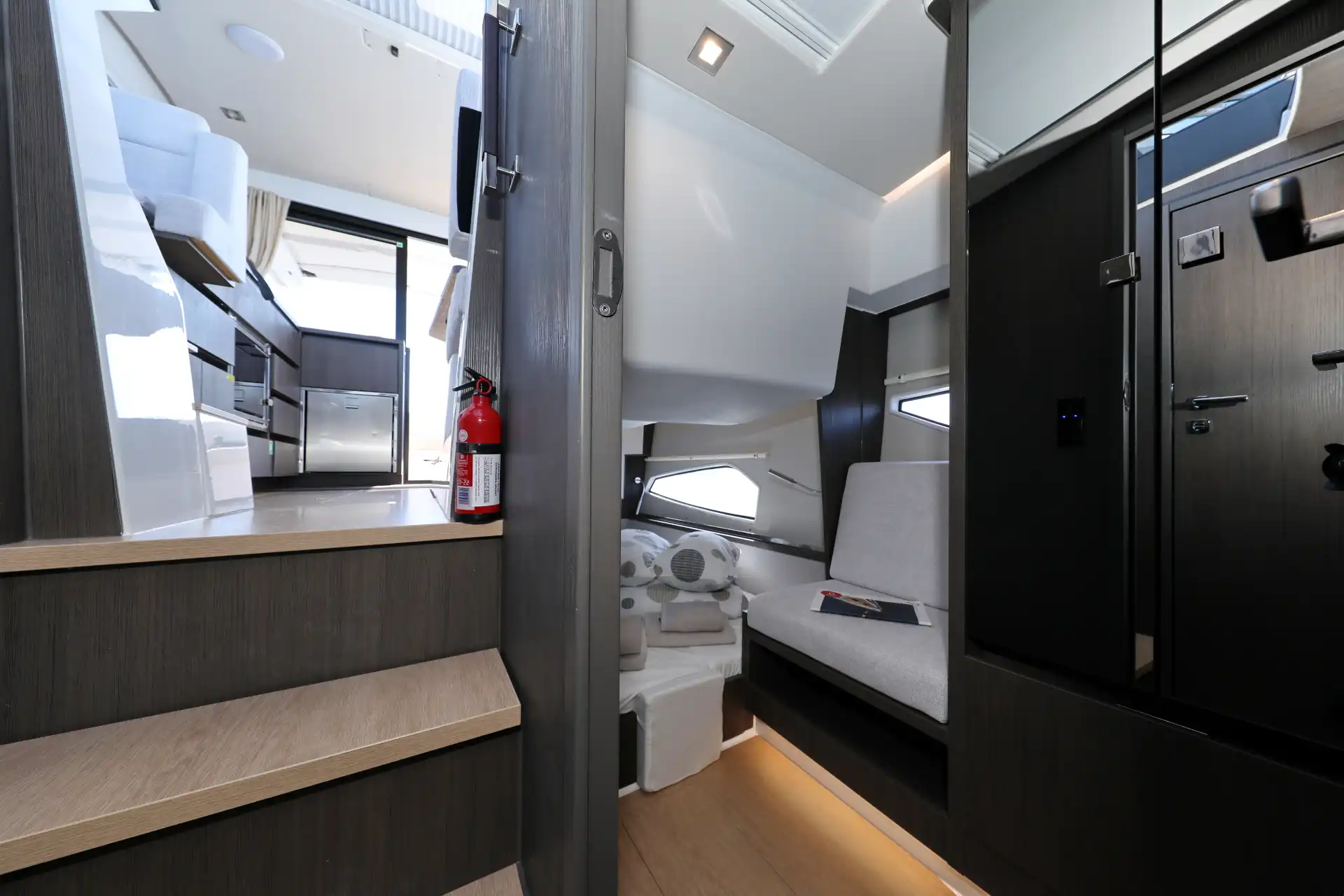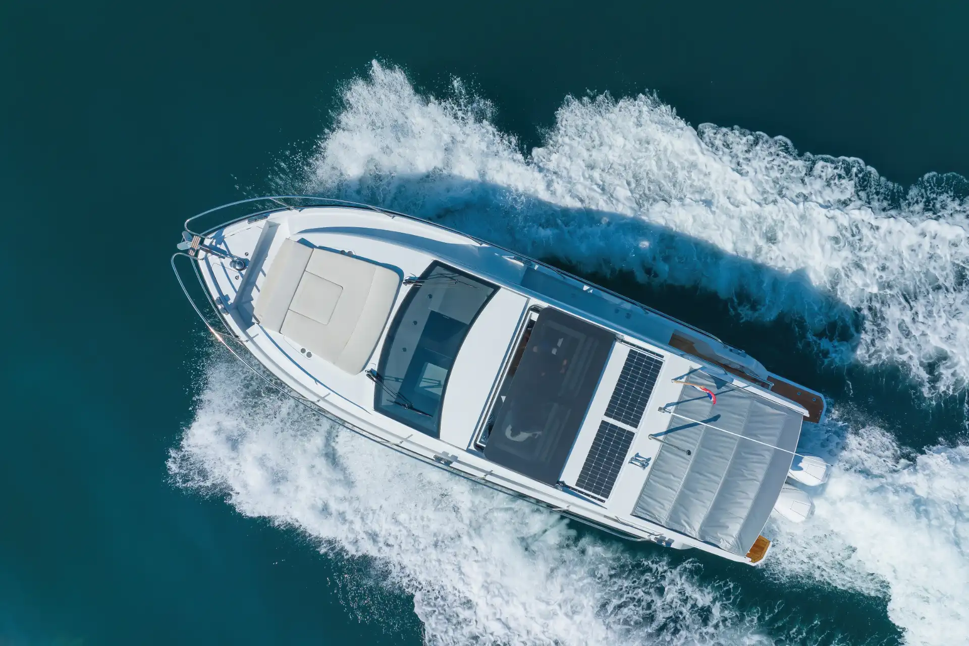 Innovative Lösungen, wie beispielsweise das große Fenster am Bug, setzen völlig neu Akzente, und schließlich und endlich gewinnt man durch den Wegfall der Innenbordmotoren enorm viel Stauraum unter Deck.