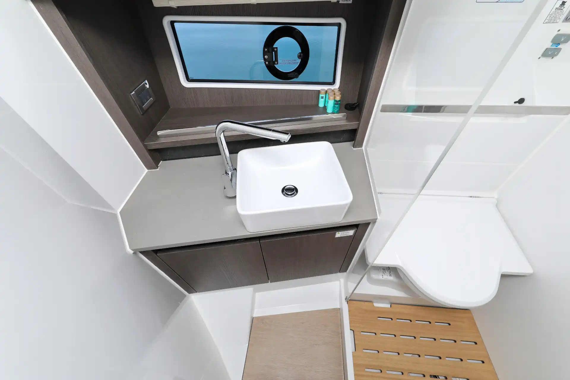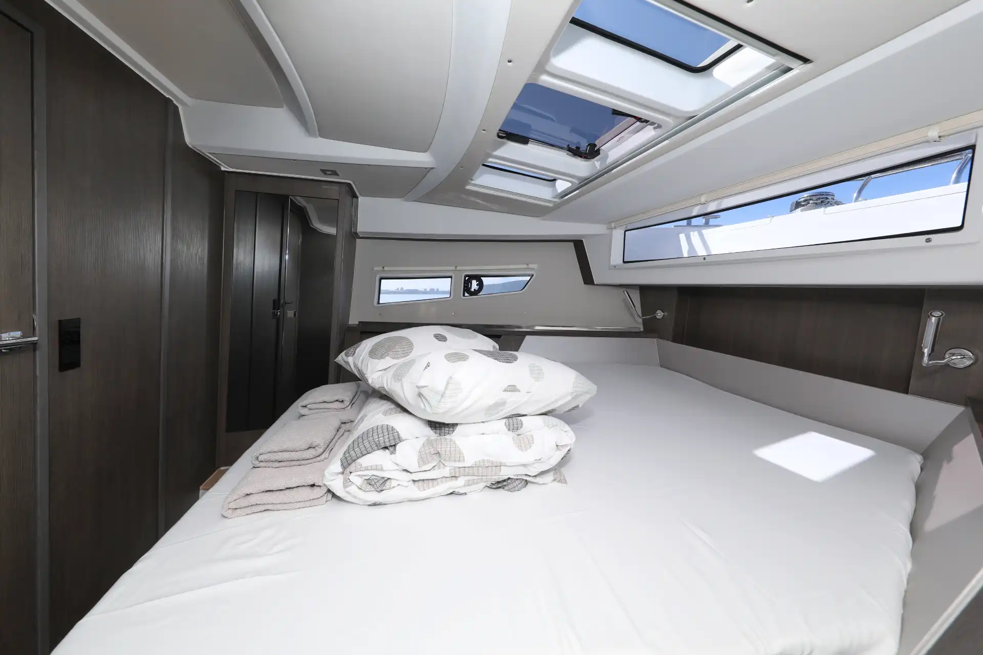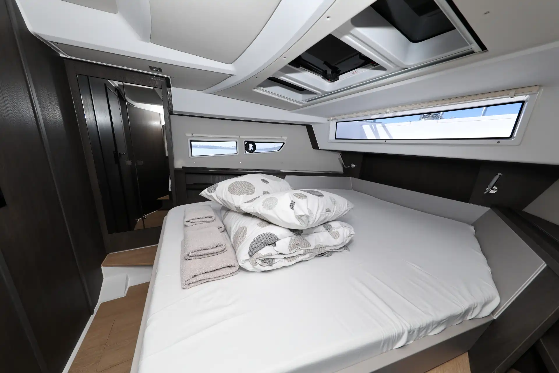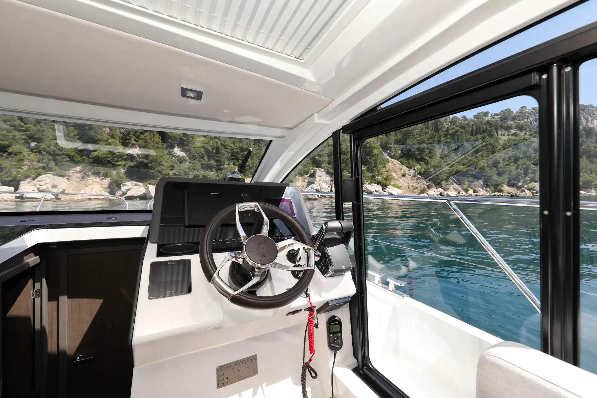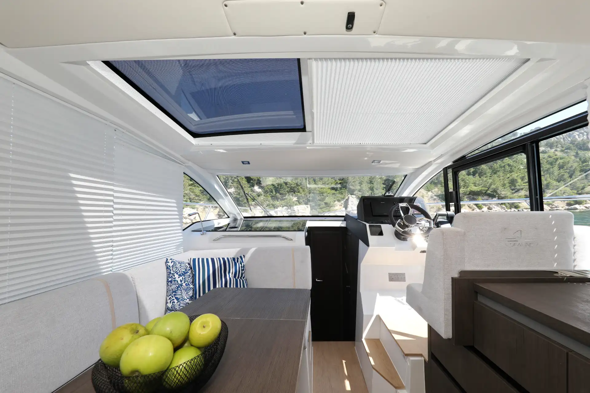 Innovative Lösungen, wie beispielsweise das große Fenster am Bug, setzen völlig neu Akzente, und schließlich und endlich gewinnt man durch den Wegfall der Innenbordmotoren enorm viel Stauraum unter Deck.