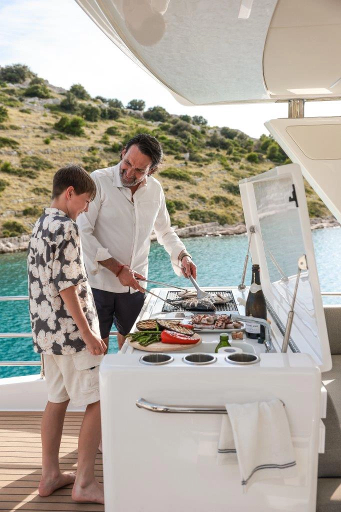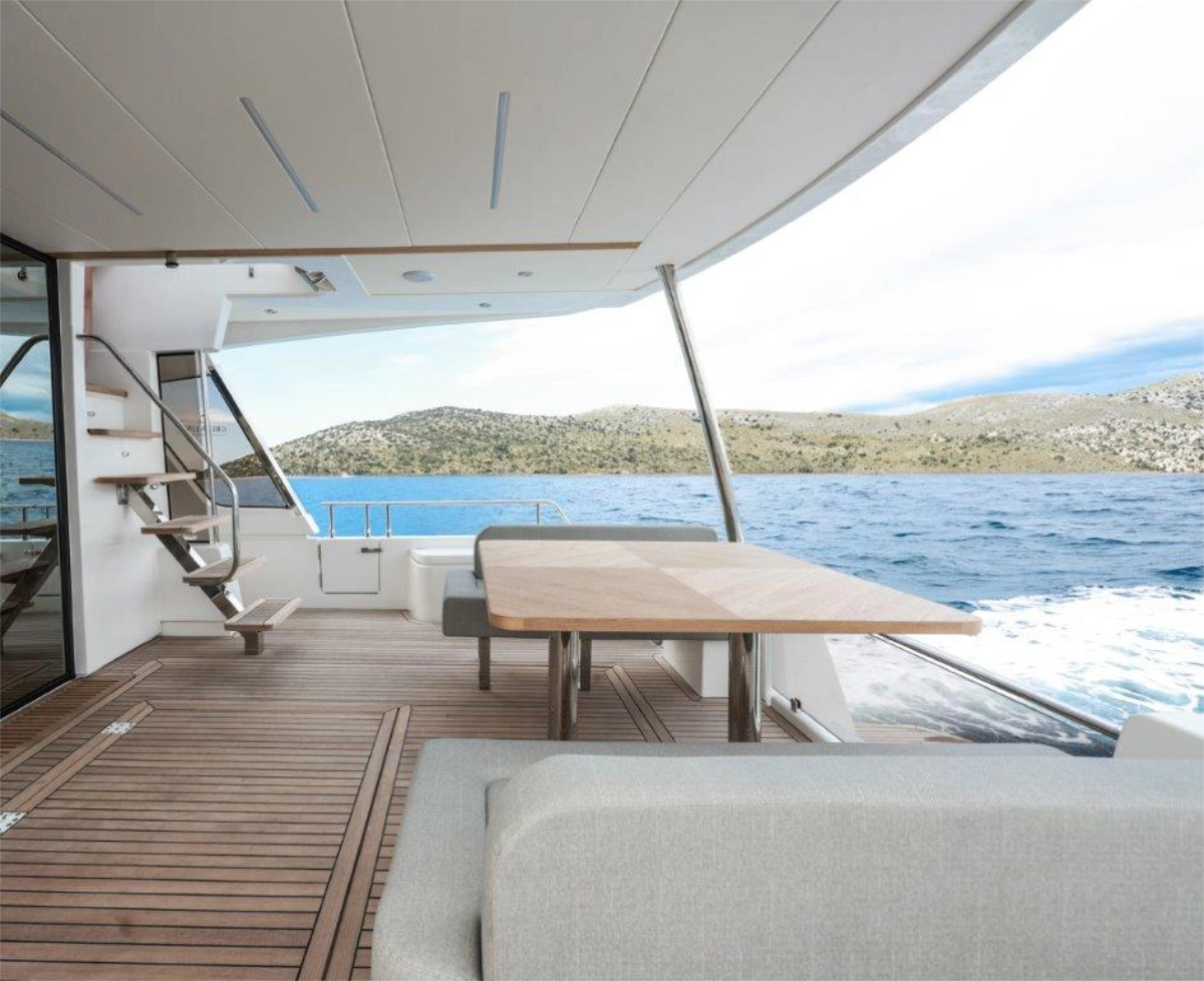 Die großzügigen Kabinen laden zu entspannenden Nächten ein, während die elegante Flybridge der perfekte Ort für Ihren morgendlichen Kaffee mit Blick auf das türkisfarbene Wasser ist. Stellen Sie sich vor, wie Sie abends unter einem sternenklaren Himmel entspannen – das sanfte Schaukeln des Wassers und die komfortablen Loungemöbel schaffen eine Atmosphäre der Ruhe und des Wohlbefindens.