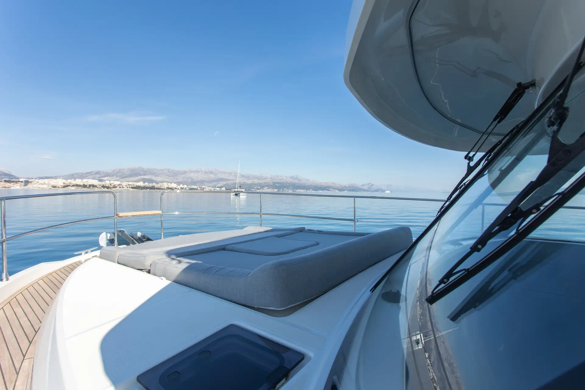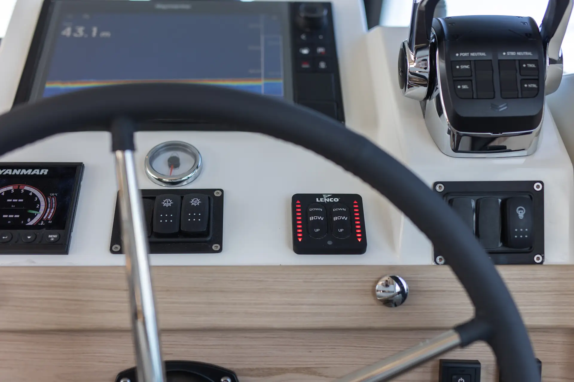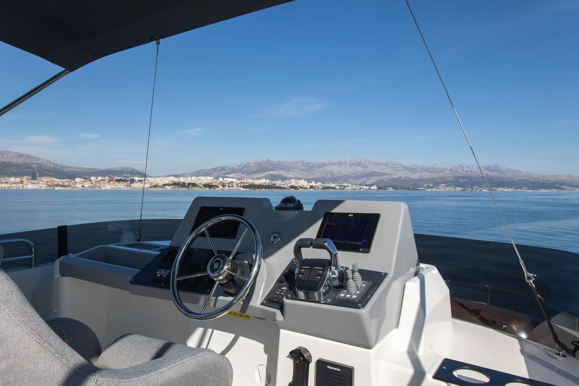 Die Steuerung ist dank Bug- und Heckstrahlruder mehr als komfortabel, mit den zwei Motoren, mit jeweils 300 PS, ist die Yacht perfekt abgestimmt.