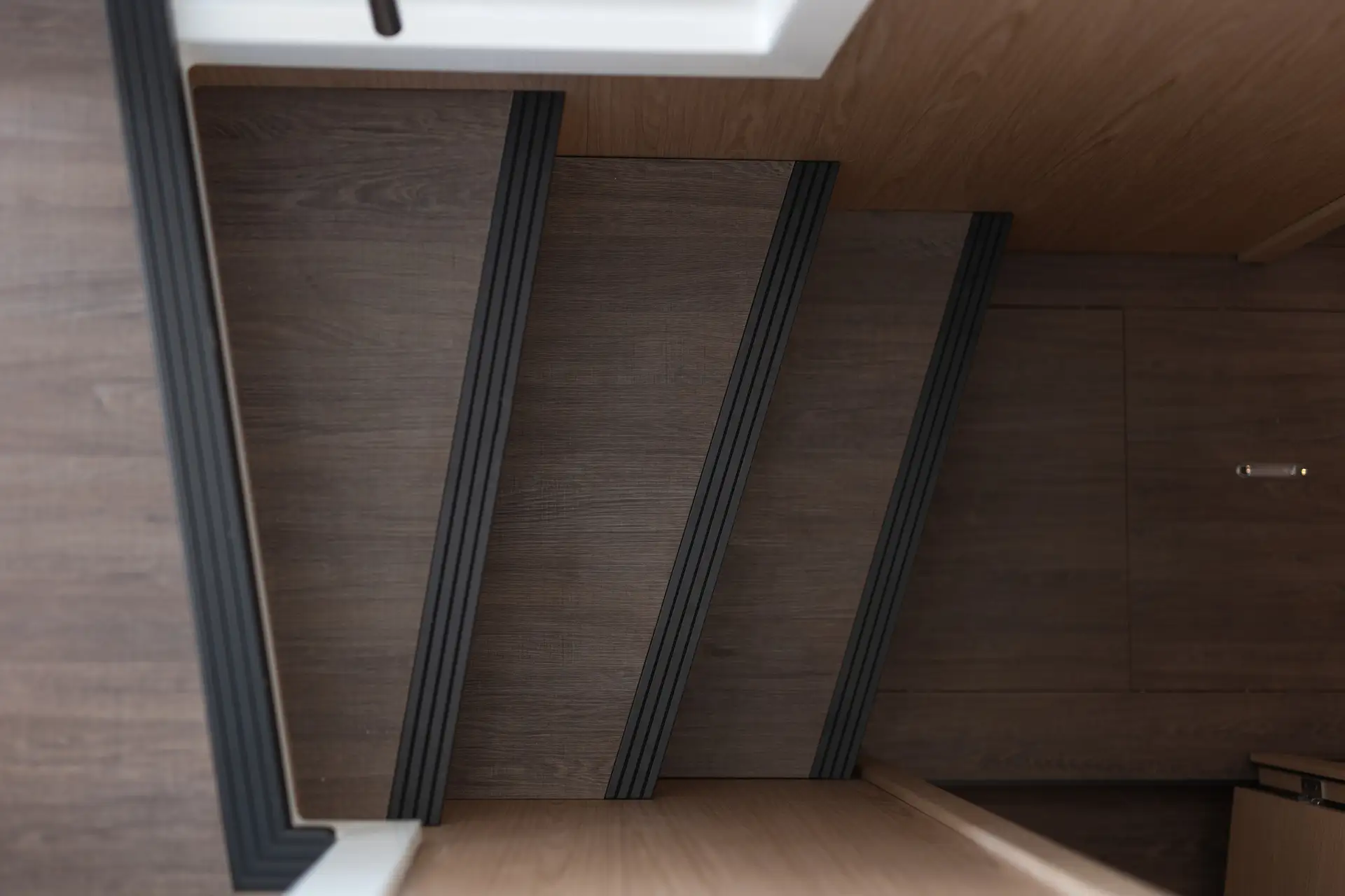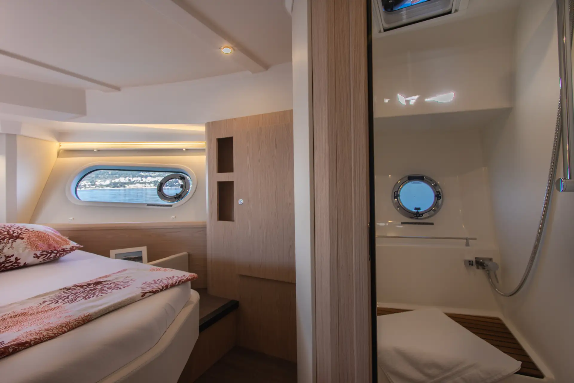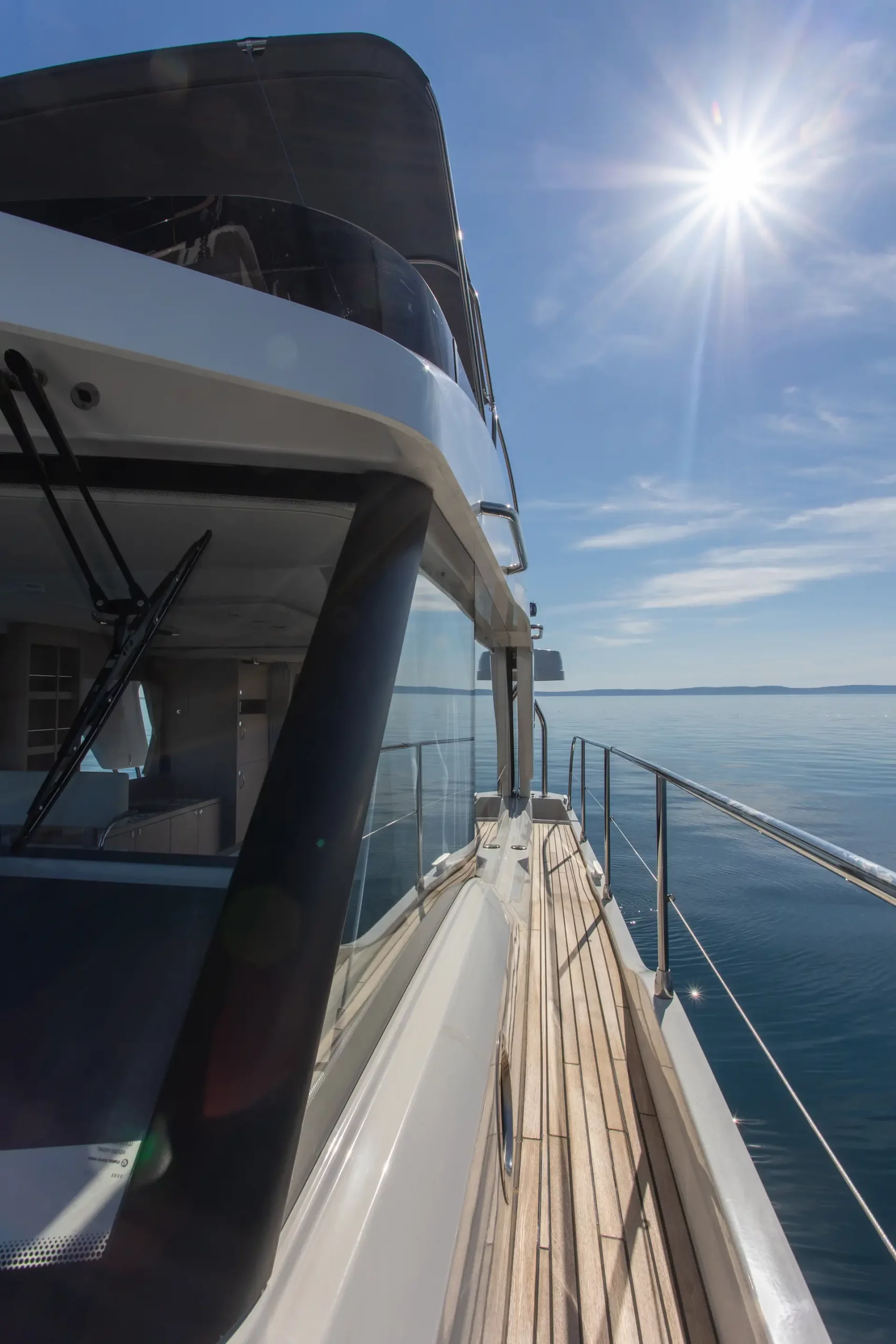 Die Steuerung ist dank Bug- und Heckstrahlruder mehr als komfortabel, mit den zwei Motoren, mit jeweils 300 PS, ist die Yacht perfekt abgestimmt.
