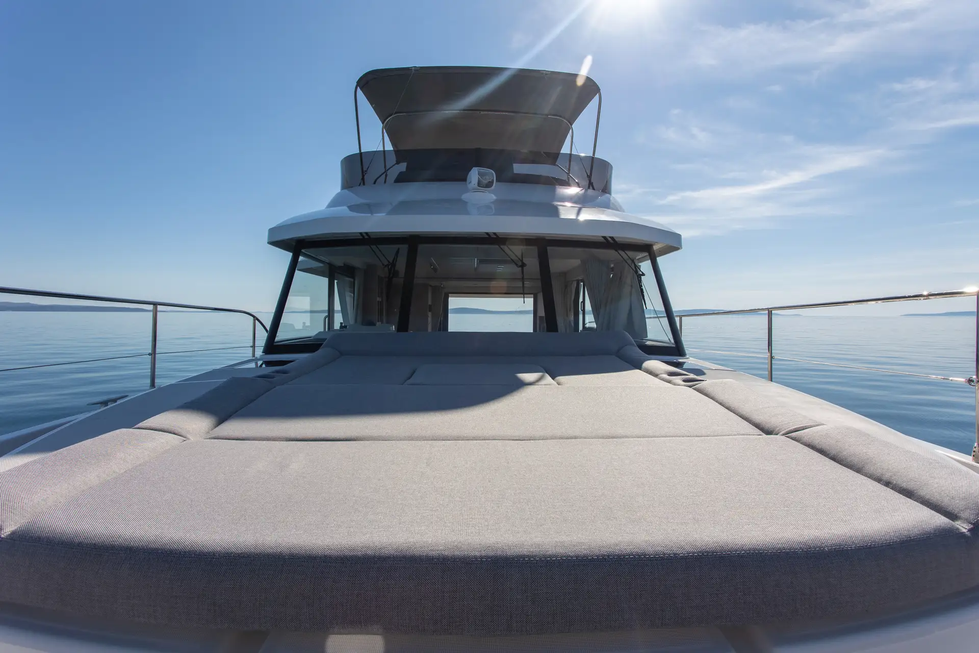 Schon allein die Flybridge ist ein voll ausgestatteter Wohnbereich. Dort wo man anderswo nur Sonnenbaden kann, hat man hier hochwertigen Raum für 6 Personen.