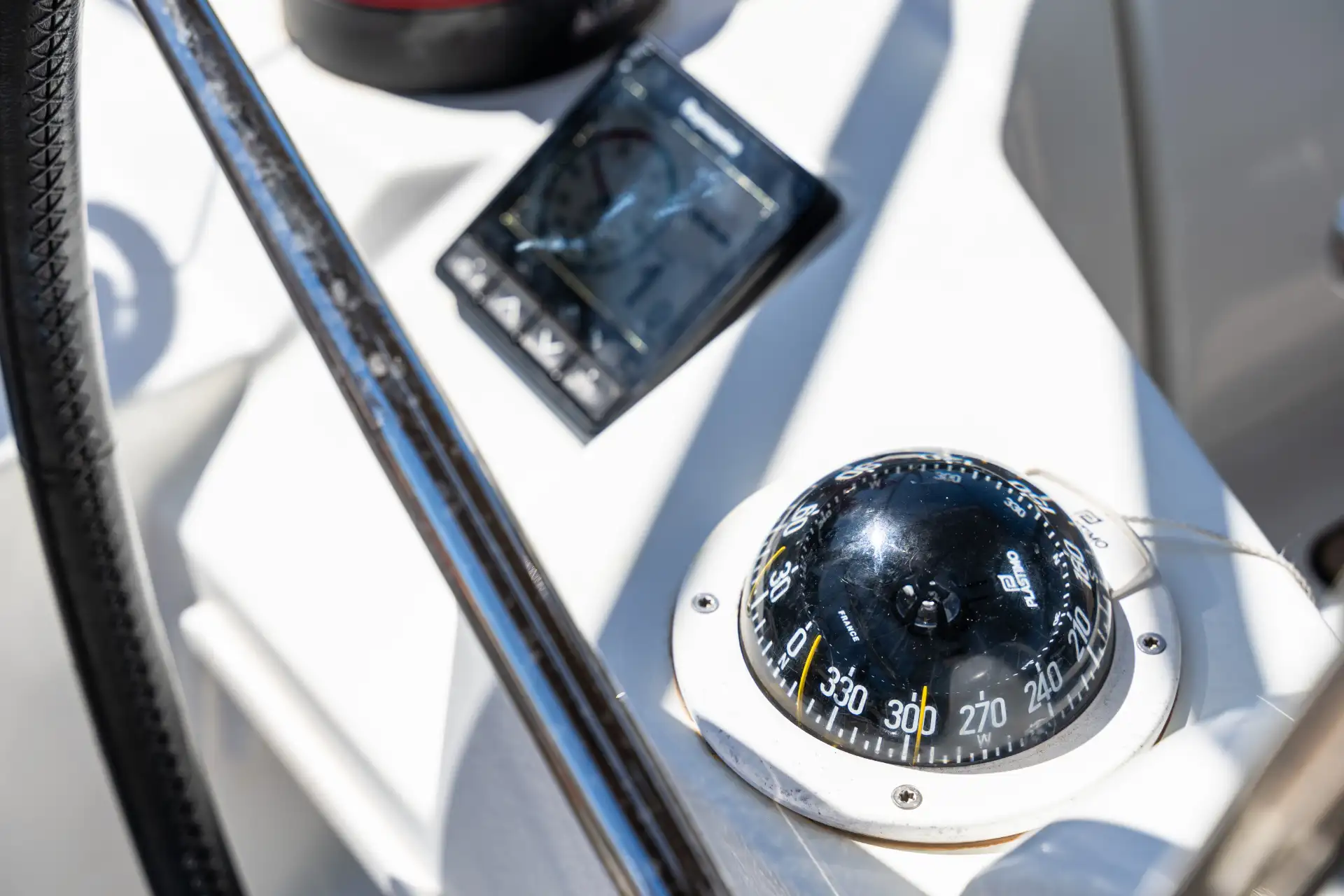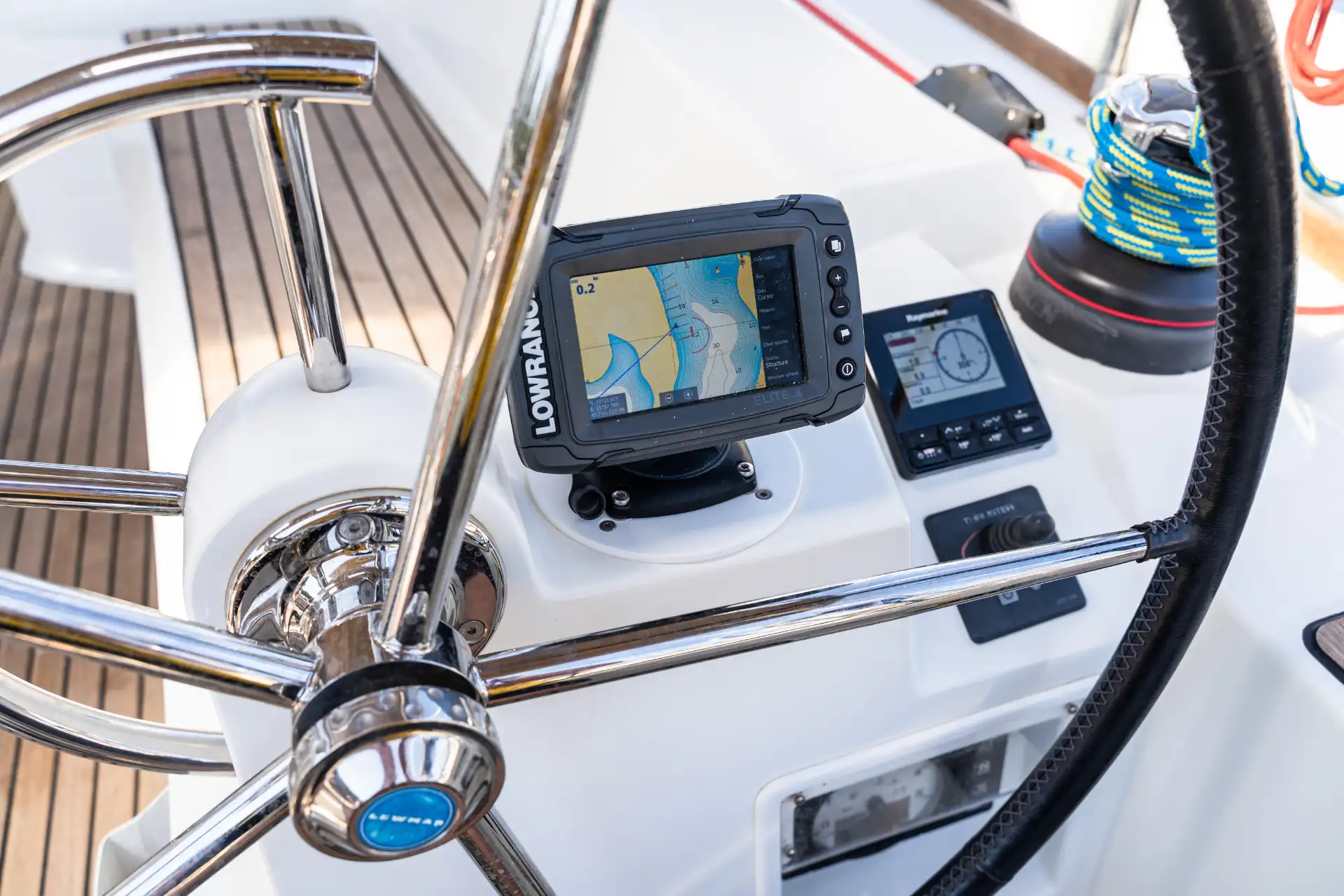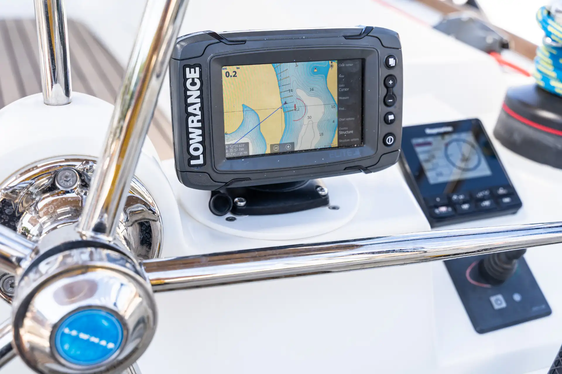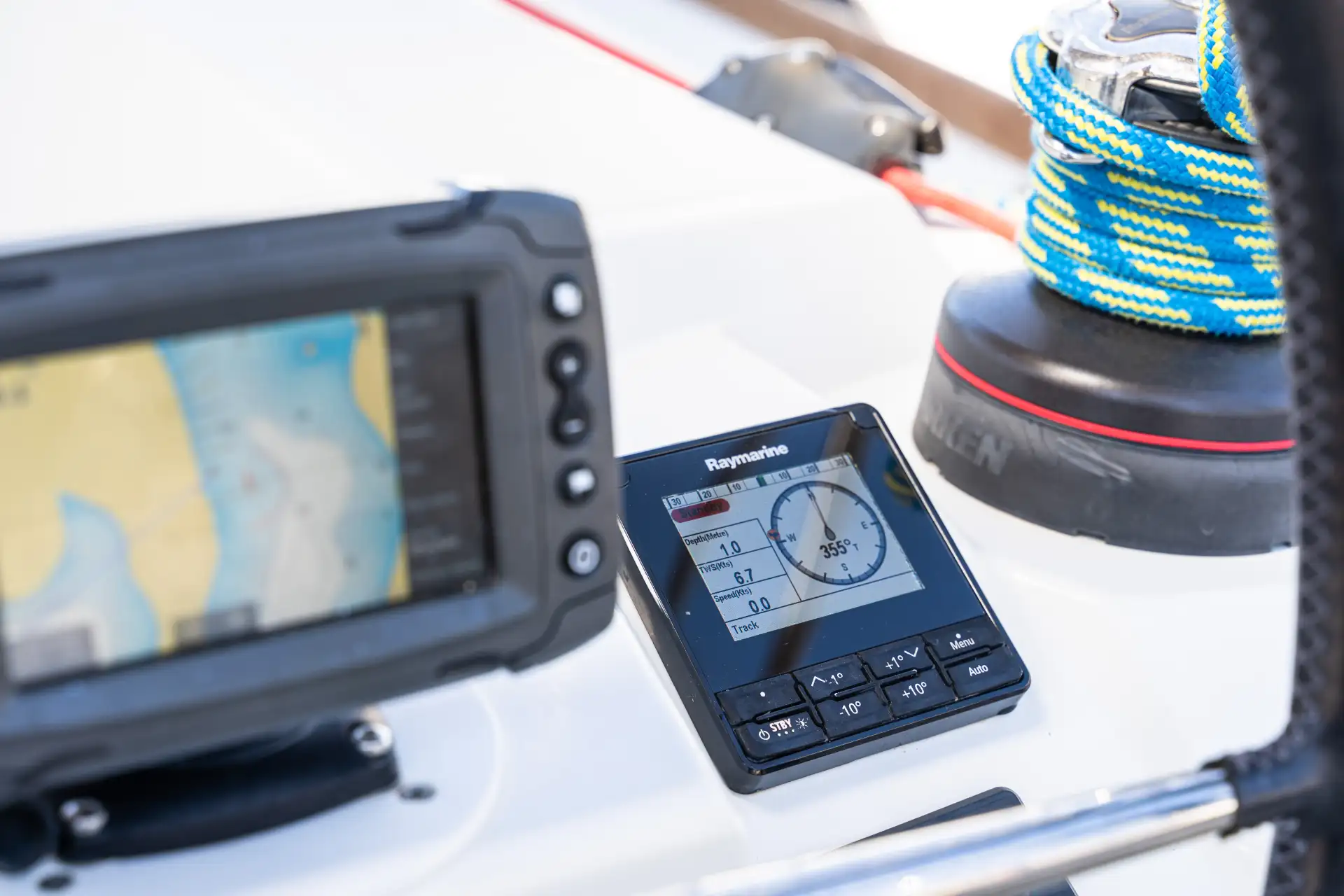 Autopilot, UKW-Funk, Lowrance GPS-Kartenplotter im Cockpit, Raymarine GPS-Kartenplotter, Kompass, Echolot, Seekarten, Windmessanlage