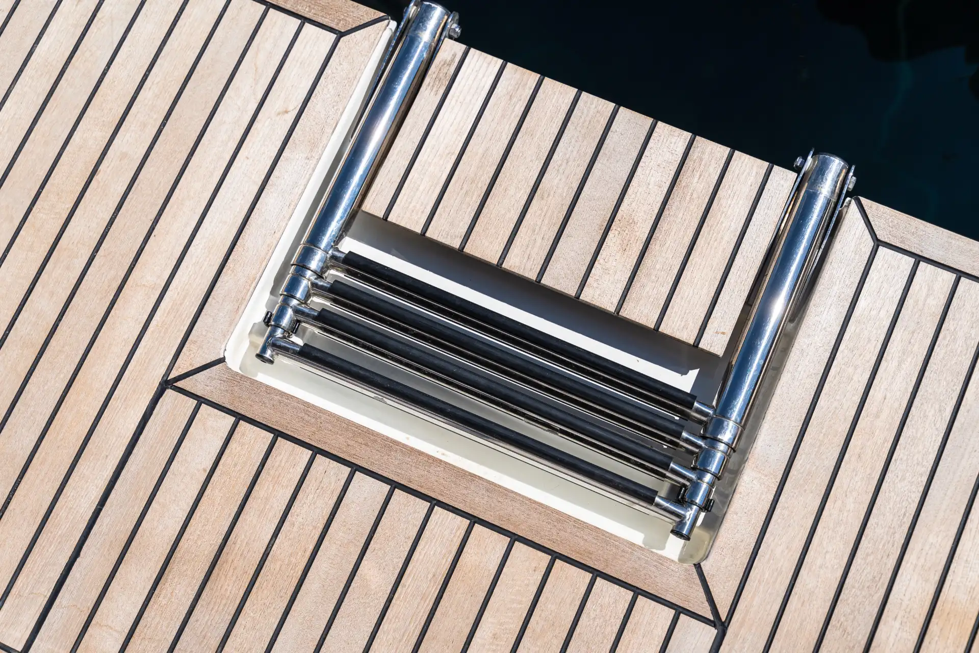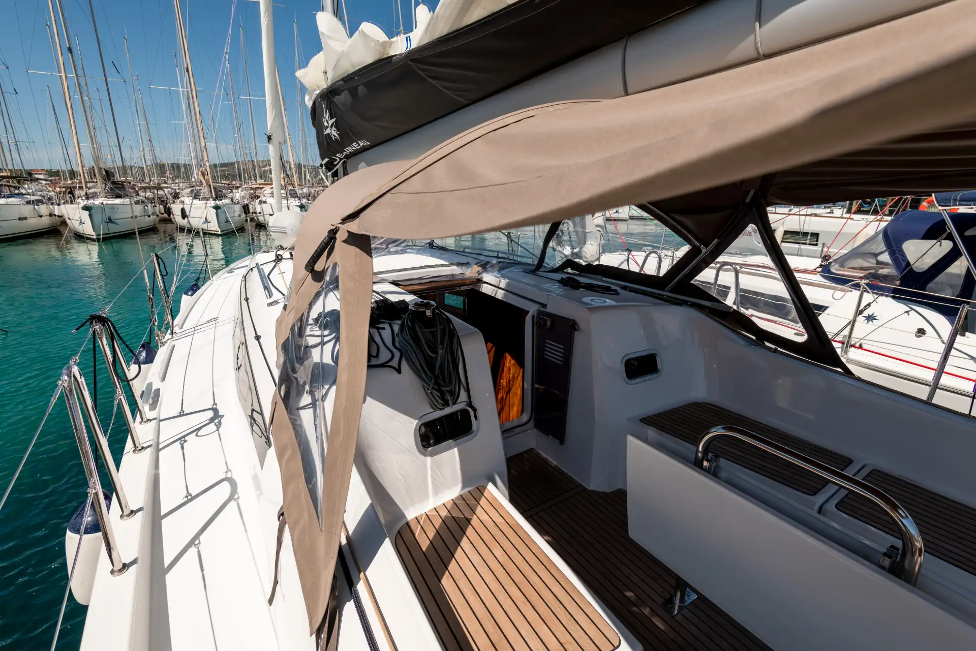 Bimini-Top, Deckdusche, Beiboot, Cockpit-Kissen, Teak Cockpit