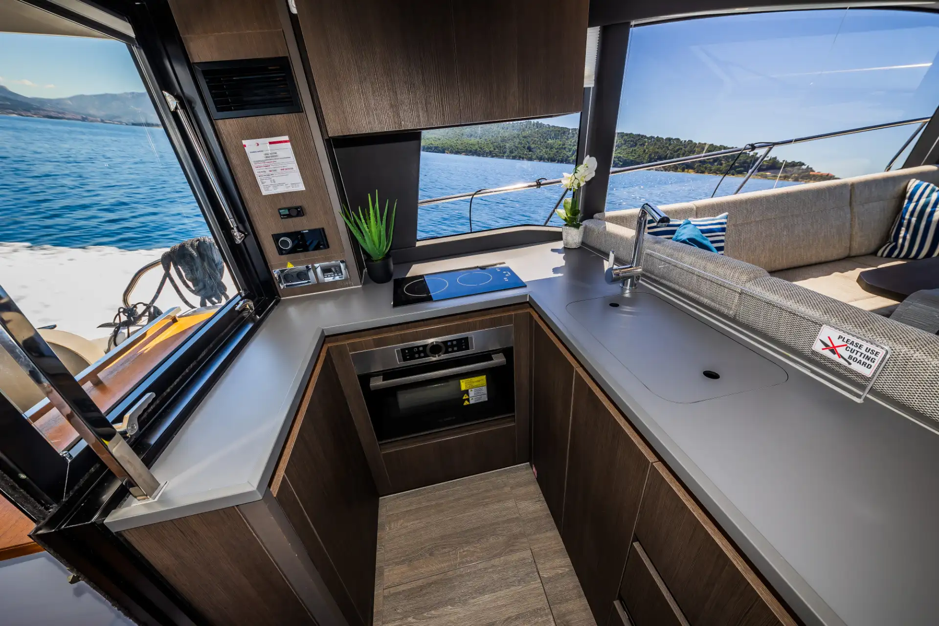 Der gemütliche Salon ist mit großen Panoramafenstern ausgestattet, die viel natürliches Licht hereinlassen und einen atemberaubenden Ausblick auf das Meer bieten. Die voll ausgestattete Küche lädt dazu ein, köstliche Mahlzeiten zuzubereiten, während sich die Gäste im eleganten Essbereich oder auf dem geräumigen Achterdeck entspannen.