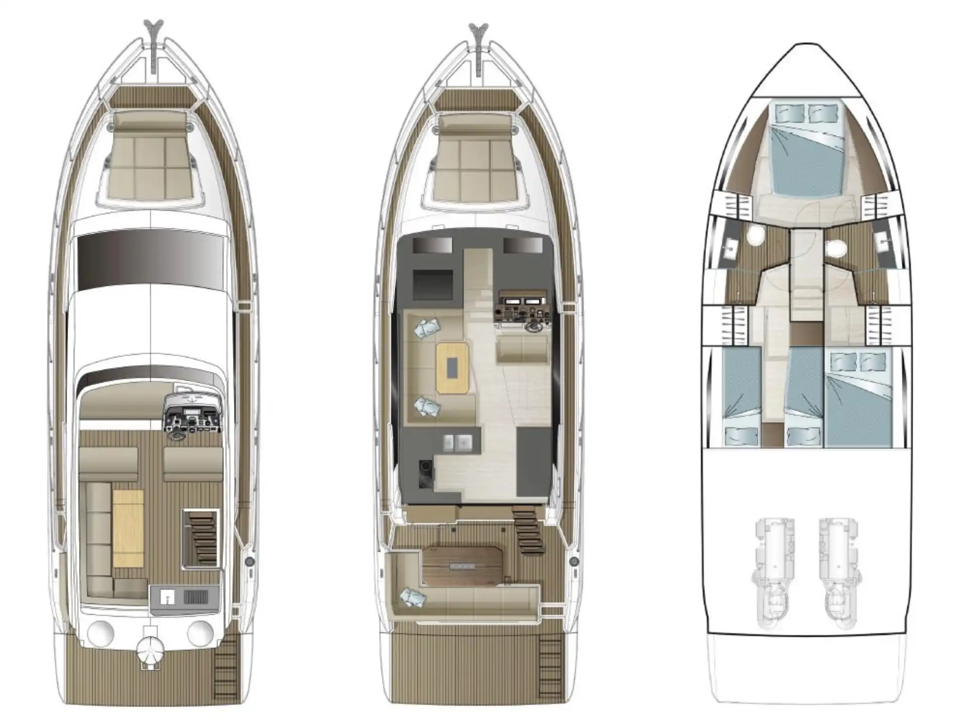 Mit ihrer Länge von knapp über 13 Metern bietet die Sealine F430 – Grace II großzügigen Platz für bis zu sechs Gäste, verteilt auf drei komfortable Kabinen. Das Interieur ist zeitgemäß gestaltet und überzeugt mit stilvollen Designakzenten und hochwertigen Materialien, die ein Gefühl von Luxus und Komfort vermitteln.
