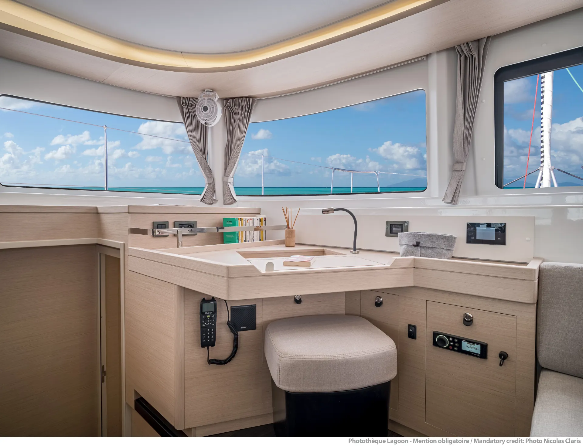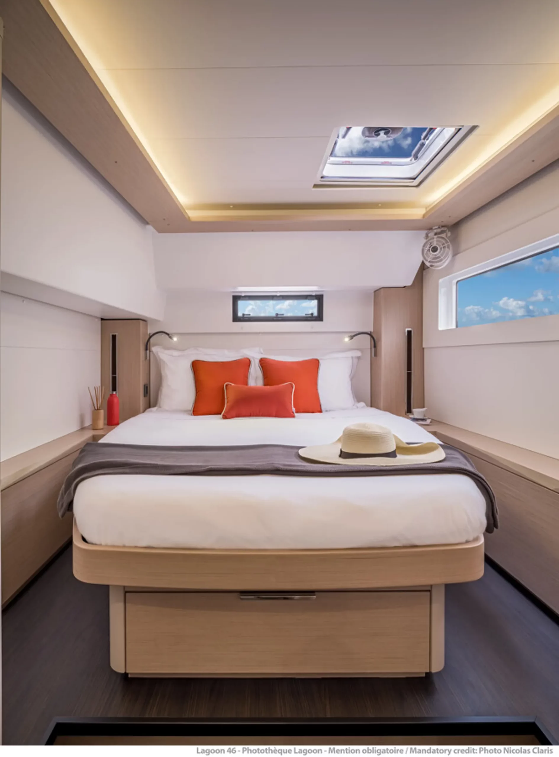 Ausgestattet mit einer Klimaanlage im Salon und den Kabinen, einem leistungsstarken Generator, einem Wassermacher, einer Spülmaschine und einem Autopiloten bietet die Lagoon 46 – Pure alles, was das Herz begehrt, um Ihr Segelabenteuer so komfortabel und sorgenfrei wie möglich zu gestalten. Moderne Sicherheitsvorkehrungen und ein durchdachtes Design garantieren ein entspanntes und luxuriöses Urlaubserlebnis auf hoher See.