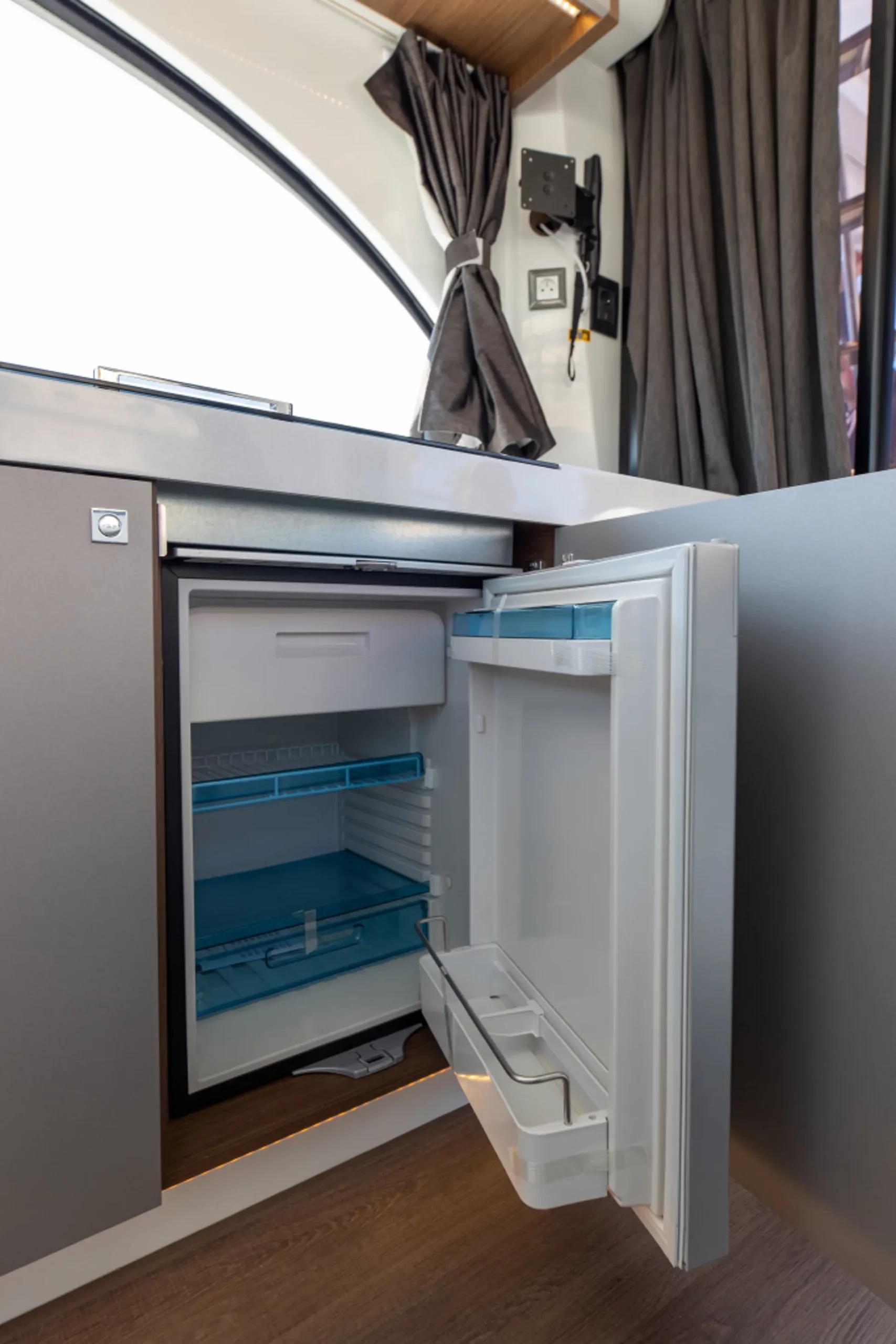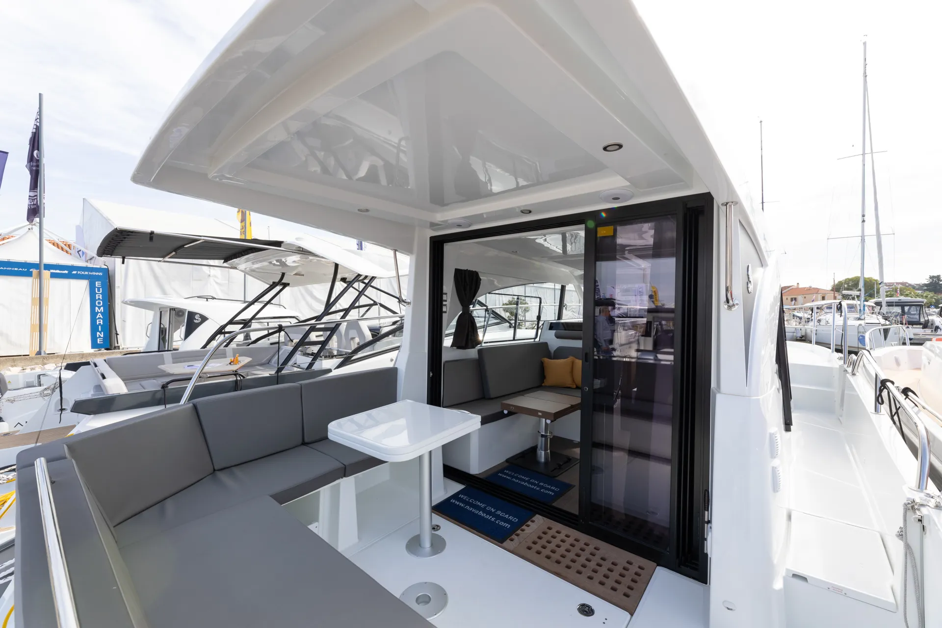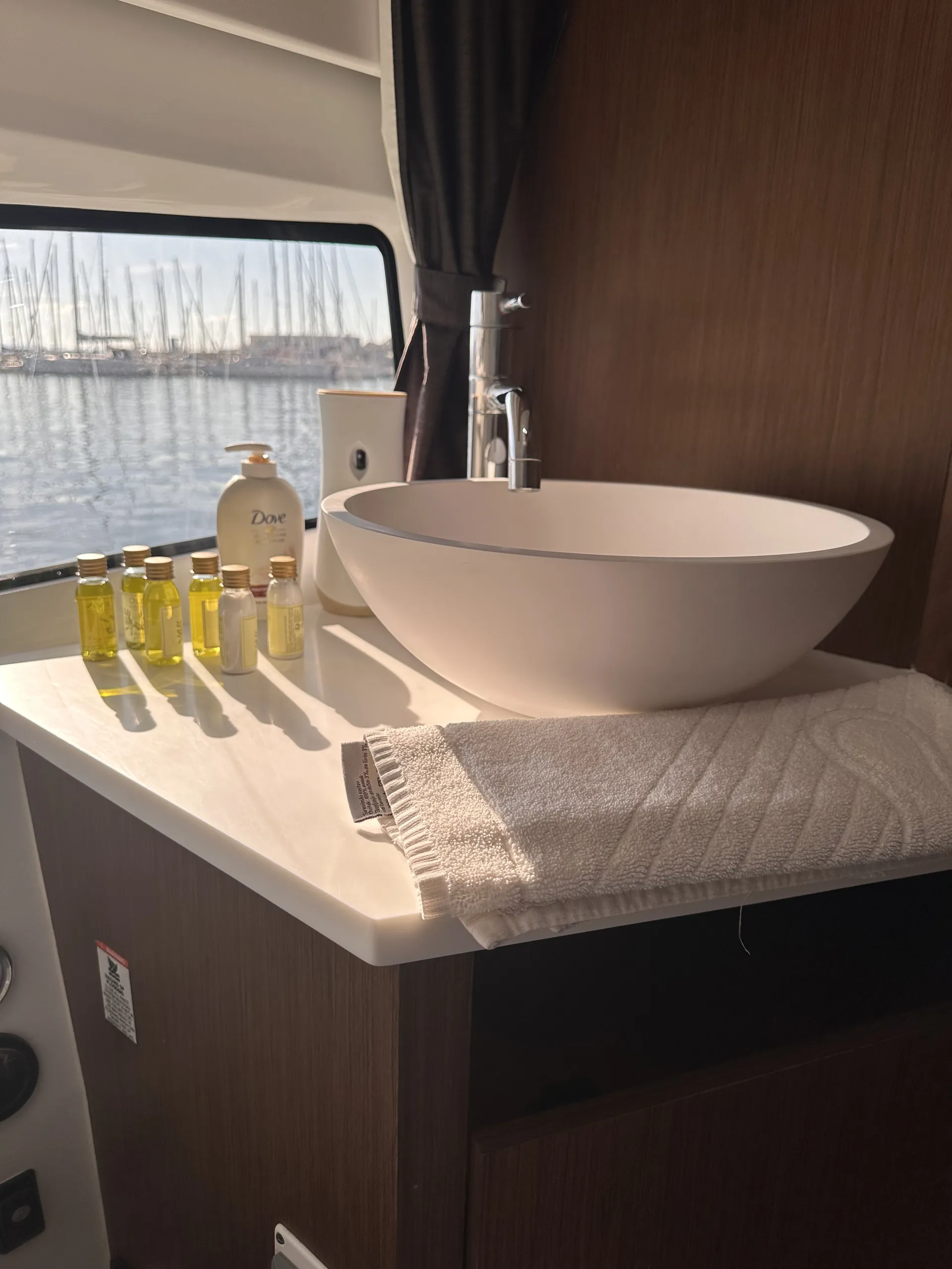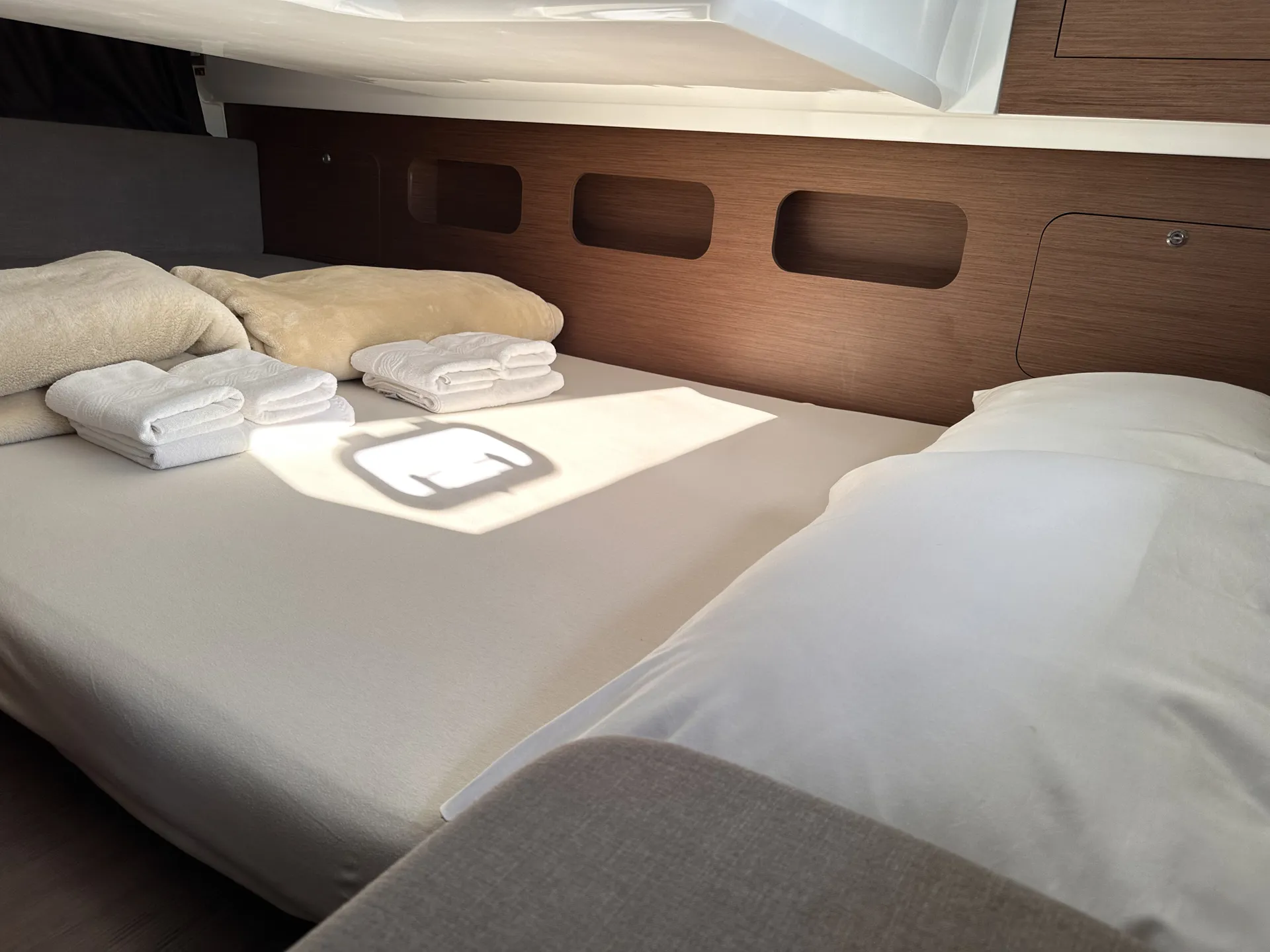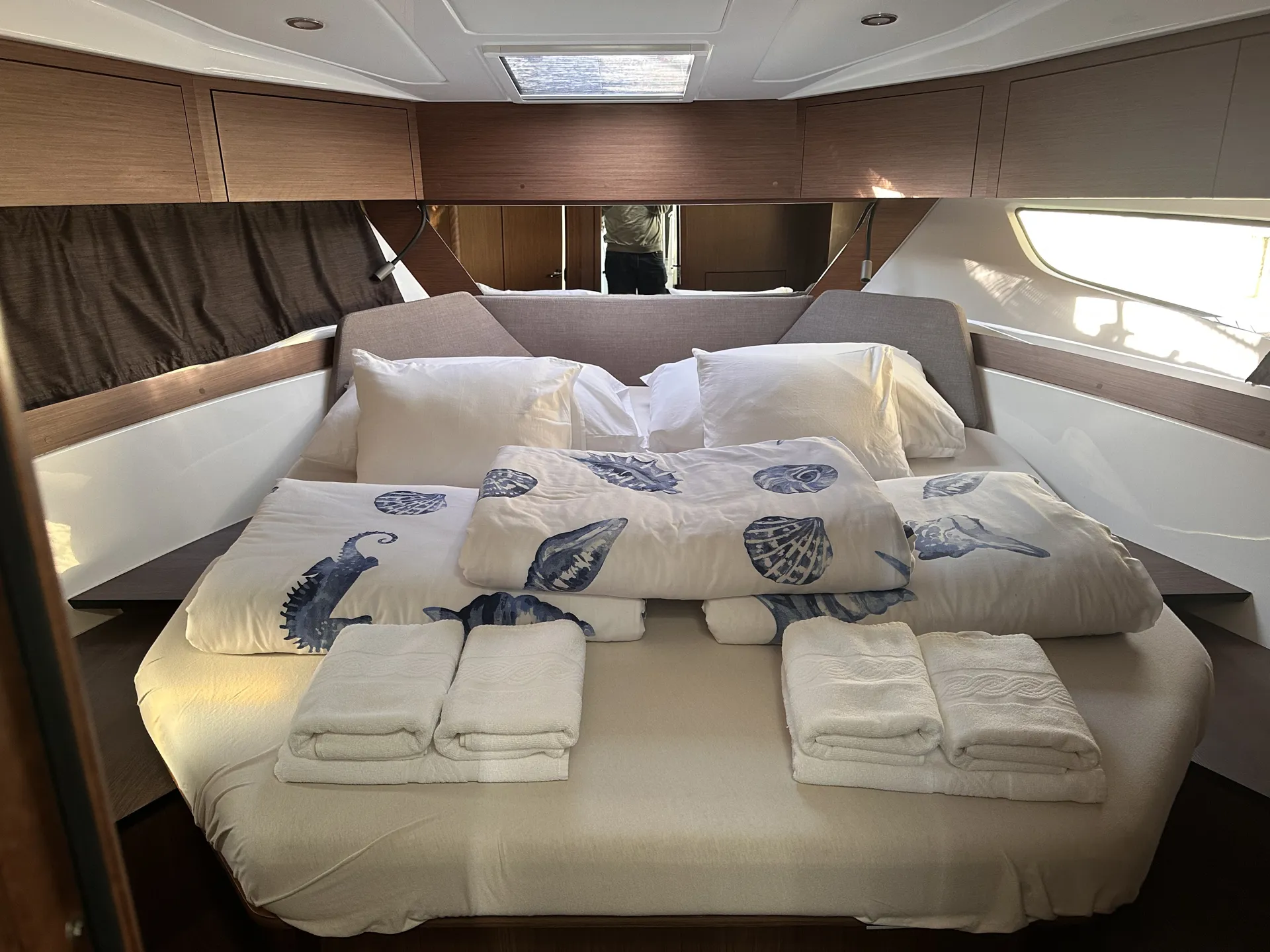 Die Flybridge beeindruckt mit ihrer großzügigen Gestaltung und lädt dazu ein, den Tag bei einem Kaffee mit Panoramablick zu beginnen oder romantische, sternenklare Nächte zu verbringen. Im Inneren erwartet Sie eine klimatisierte Umgebung mit lichtdurchflutetem Salon, maßgeschneidertem Komfort und einer voll ausgestatteten Pantry, die das Gefühl von „Zuhause“ auf See vermittelt. Hier trifft innovative Designsprache auf Funktionalität, um jeden Aspekt Ihres Yachturlaubs besonders zu machen.