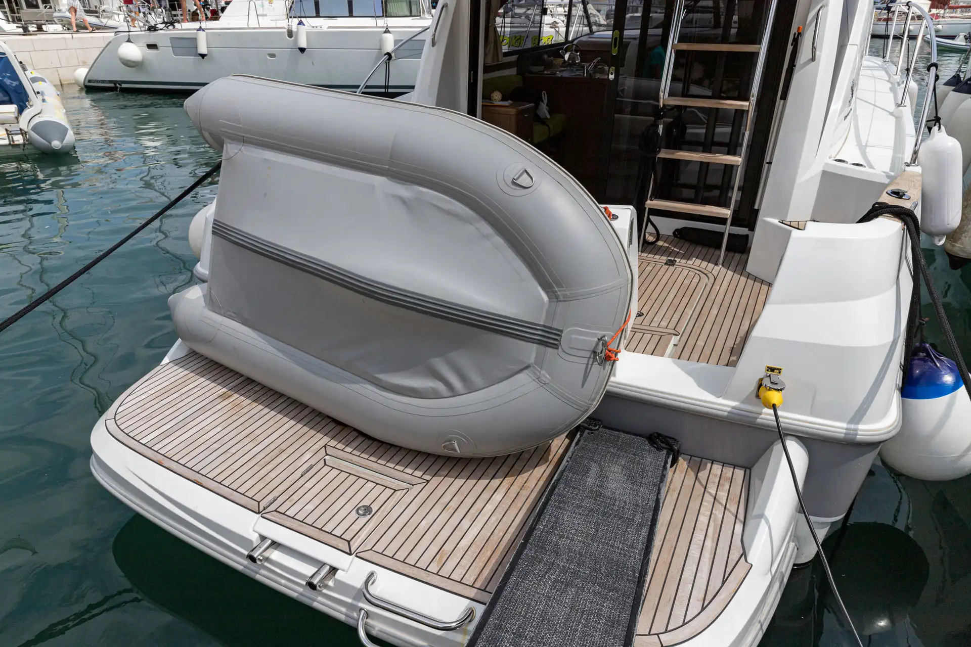 Beiboot mit Aussenborder, Bimini Verdeck, Badeleiter, Heckdusche warm/kalt, Suchscheinwerfer, Pflichtpersenning Tisch, Cockpit Kissen, Sonnenliege auf Vor Deck, Sonnenliege auf Flybridge