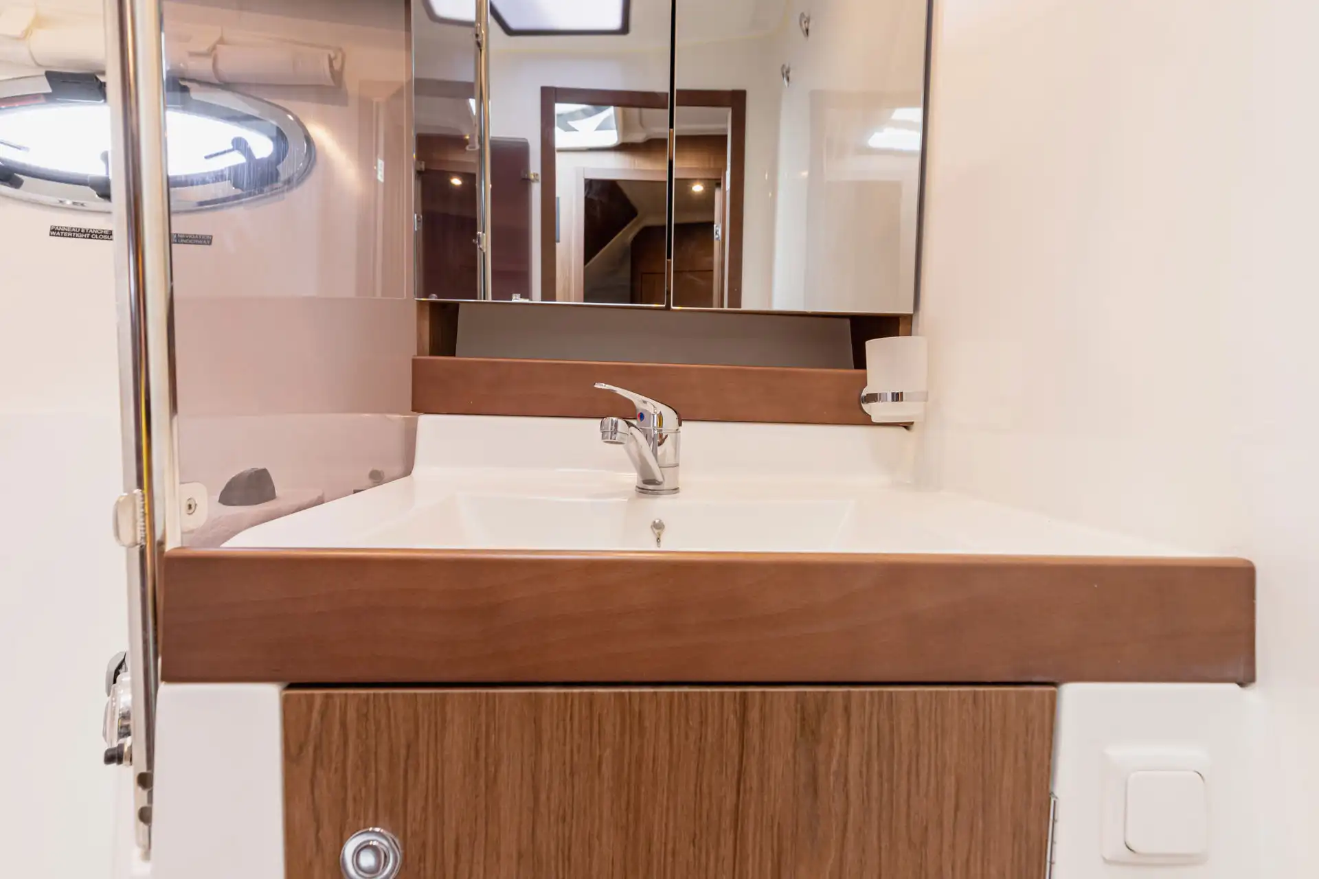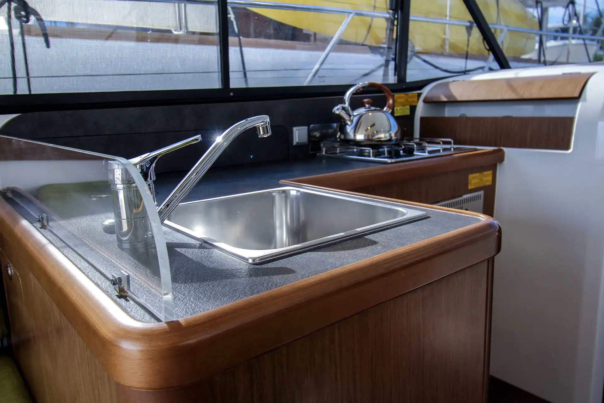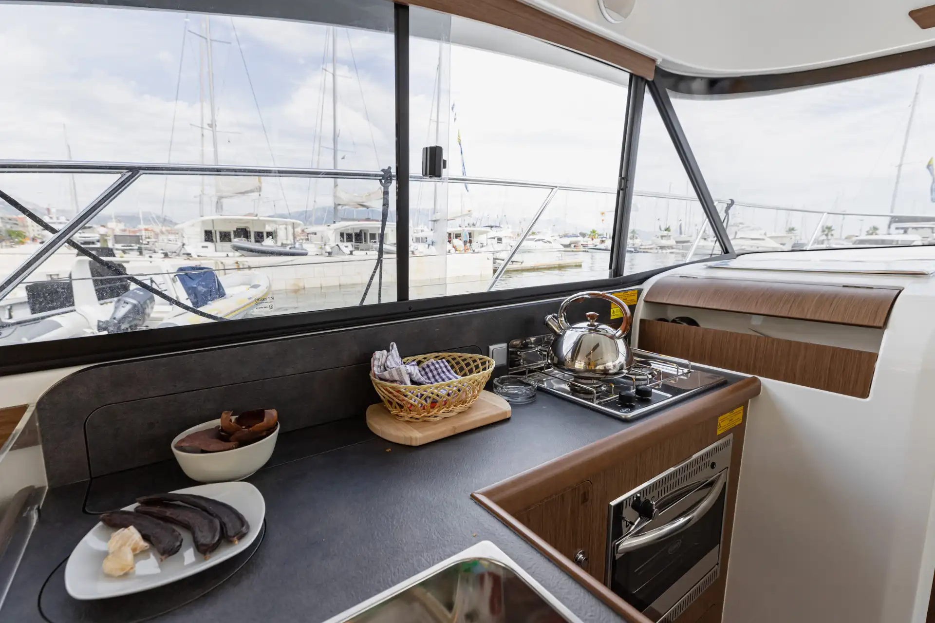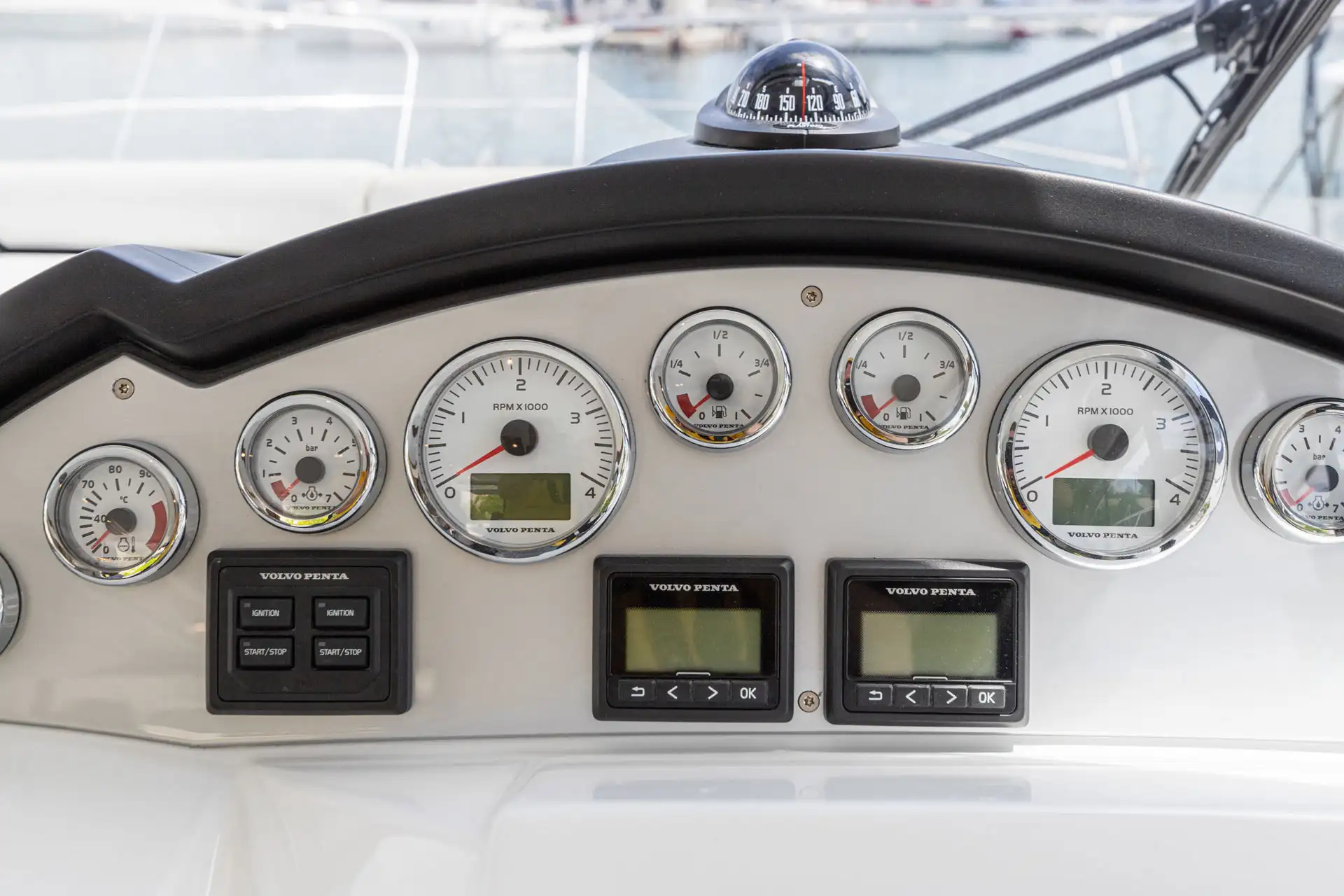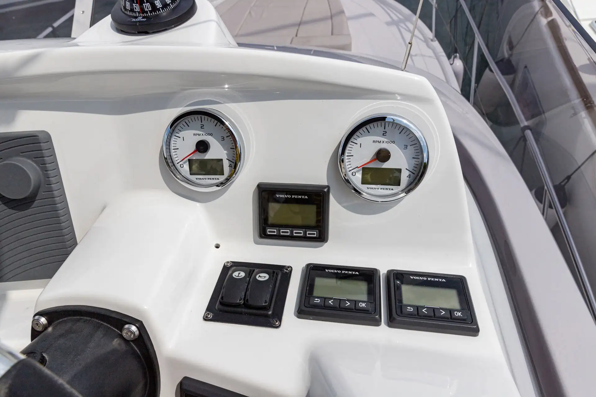 Die voll ausgestattete Pantry, ein leistungsstarker Generator und eine Klimaanlage sorgen für ein wohnliches Ambiente. Mit Bug- und Heckstrahlruder kann der Skipper stressfrei und unbesorgt manövrieren, da die Motoryacht äußerst präzise reagiert, ein Beweis für das perfekte Bootsdesign.