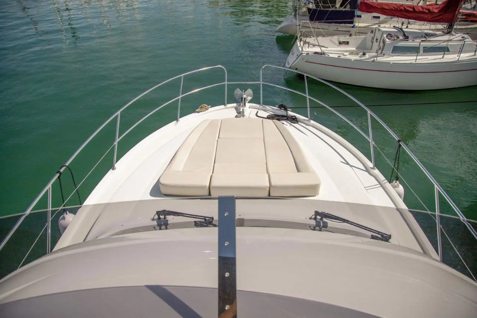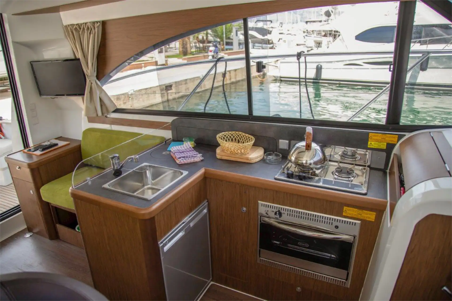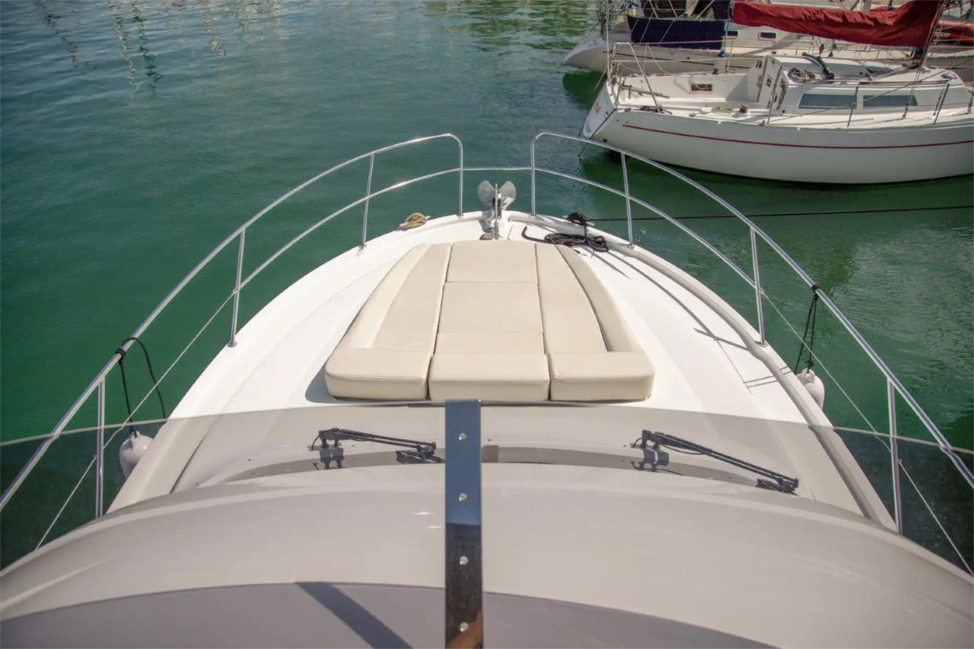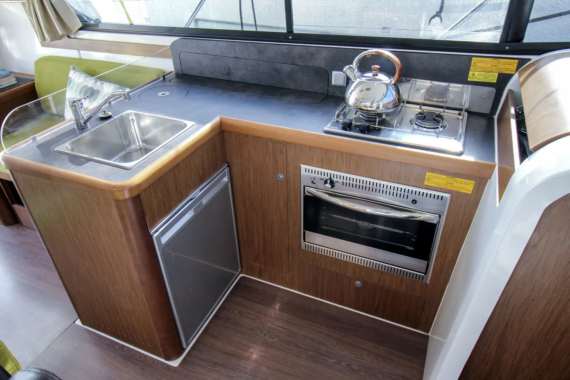 Die voll ausgestattete Pantry, ein leistungsstarker Generator und eine Klimaanlage sorgen für ein wohnliches Ambiente. Mit Bug- und Heckstrahlruder kann der Skipper stressfrei und unbesorgt manövrieren, da die Motoryacht äußerst präzise reagiert, ein Beweis für das perfekte Bootsdesign.