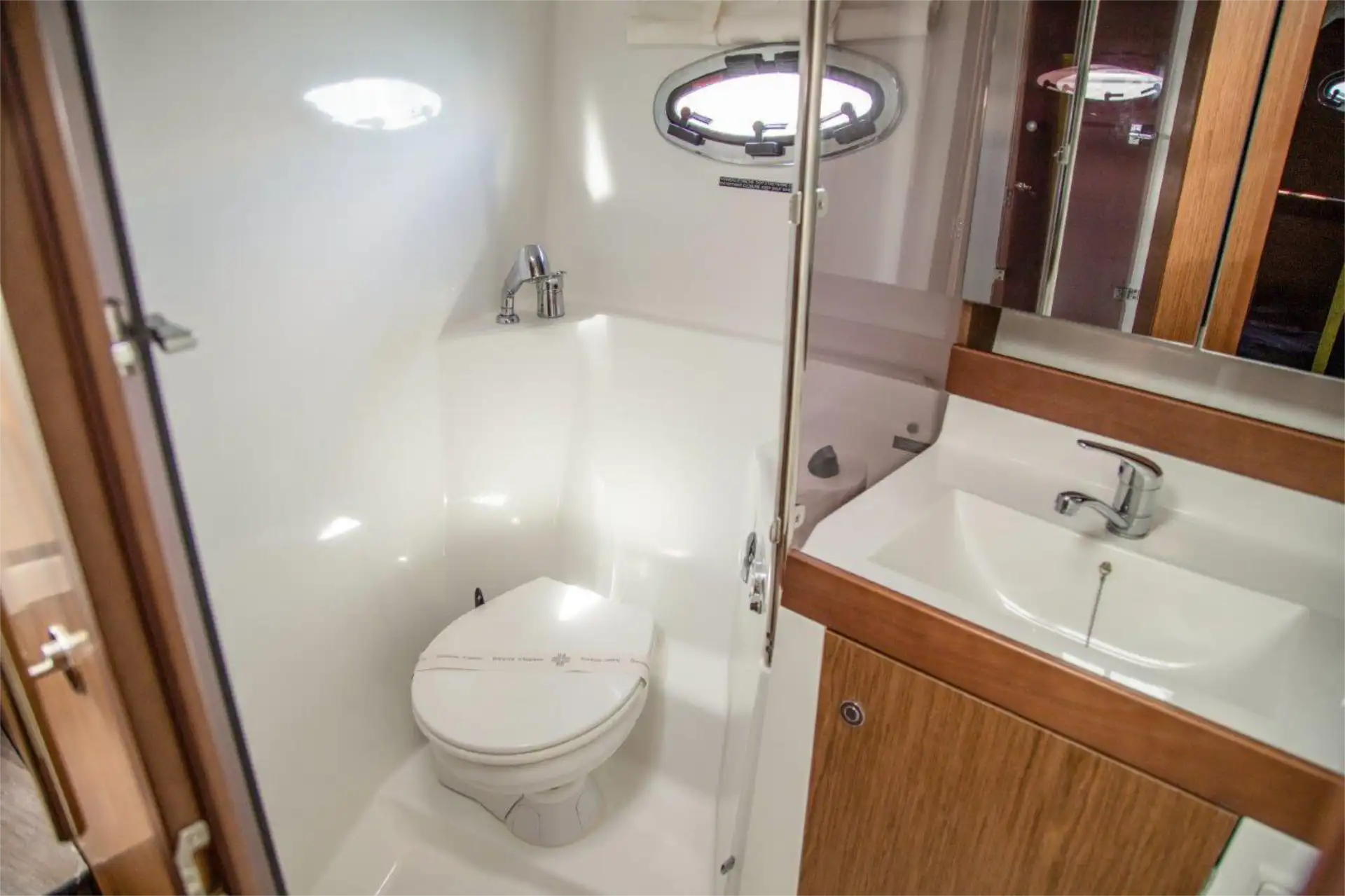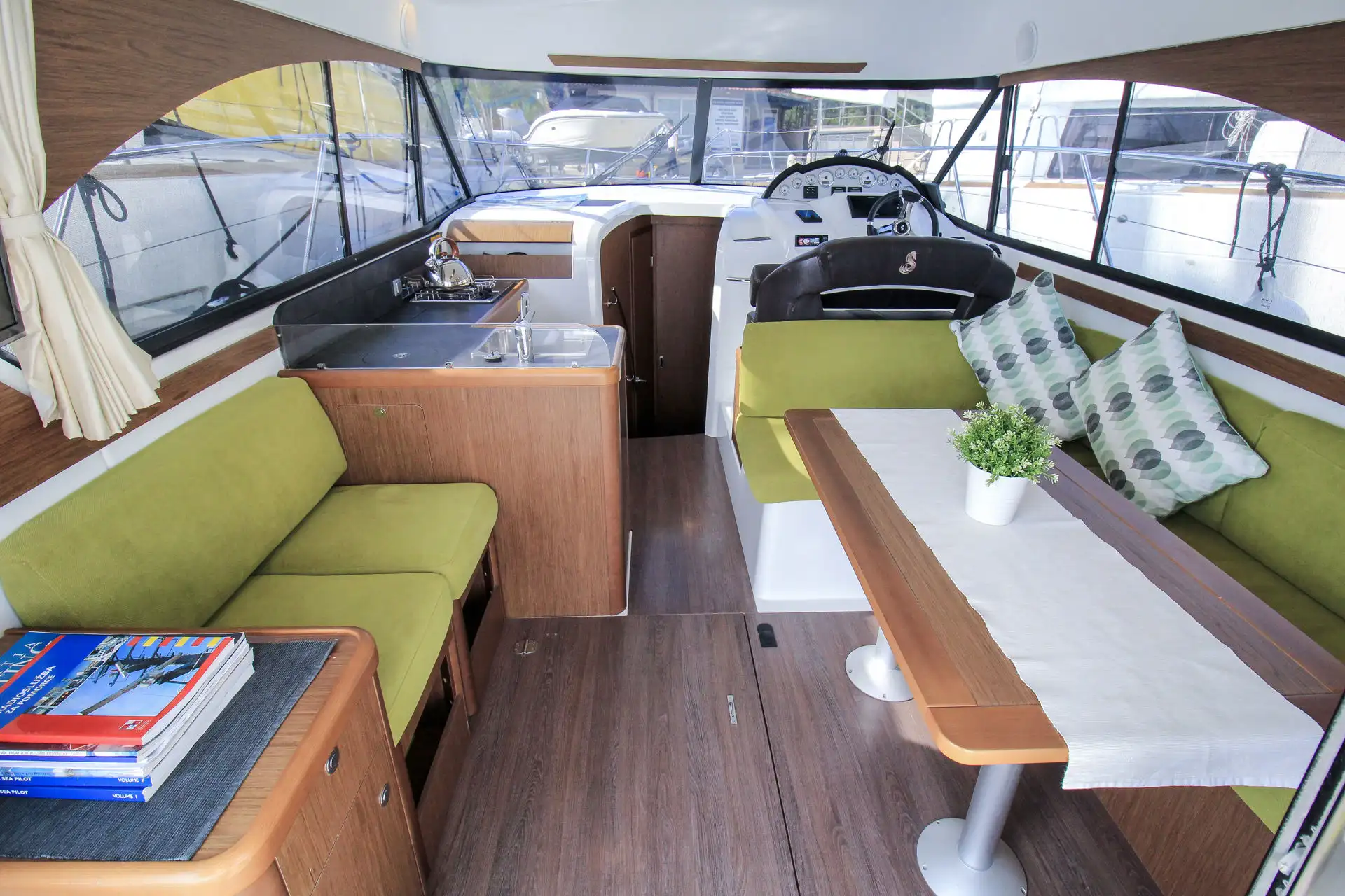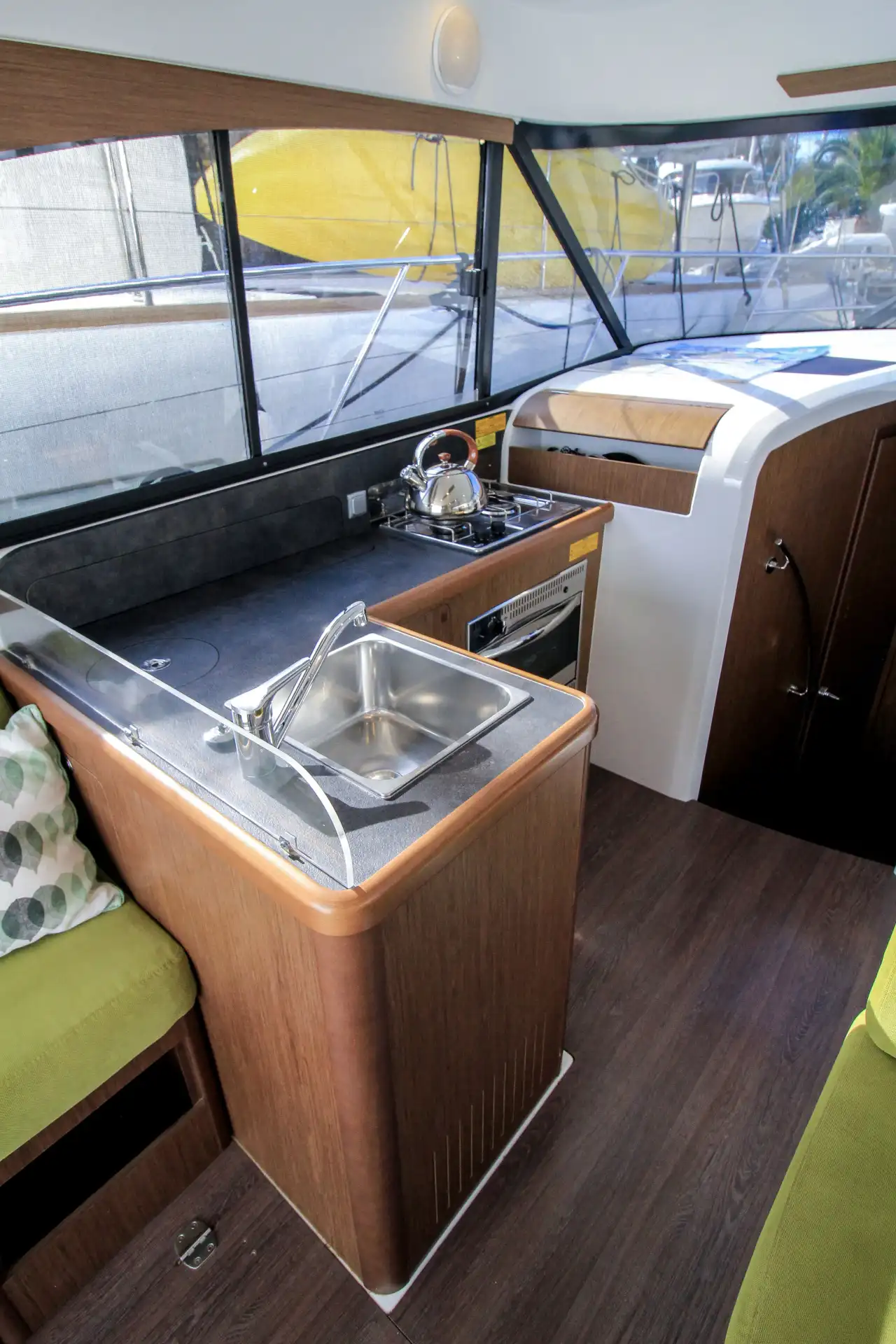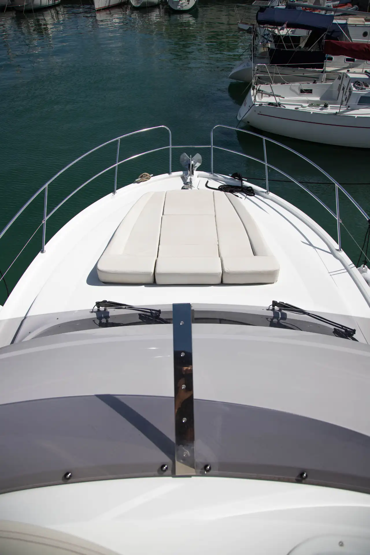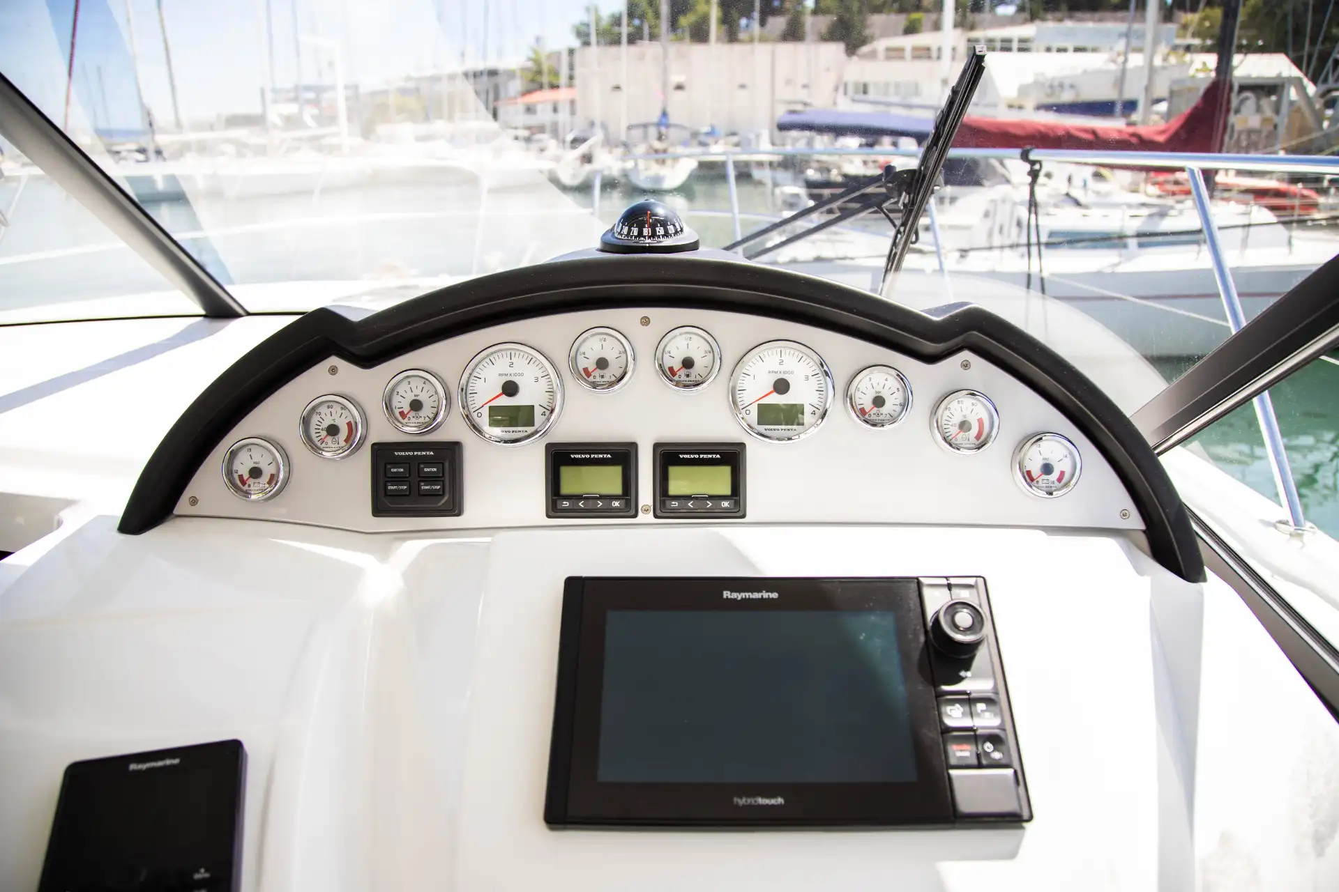 Die voll ausgestattete Pantry, ein leistungsstarker Generator und eine Klimaanlage sorgen für ein wohnliches Ambiente. Mit Bug- und Heckstrahlruder kann der Skipper stressfrei und unbesorgt manövrieren, da die Motoryacht äußerst präzise reagiert, ein Beweis für das perfekte Bootsdesign.