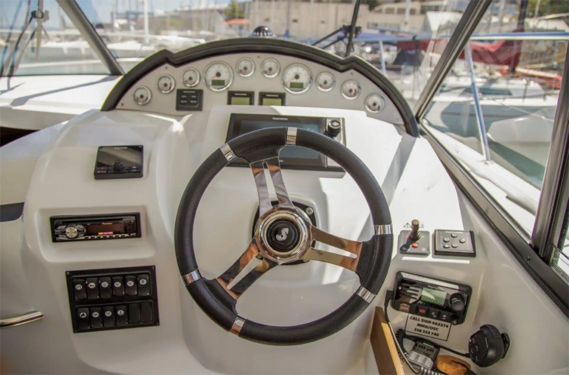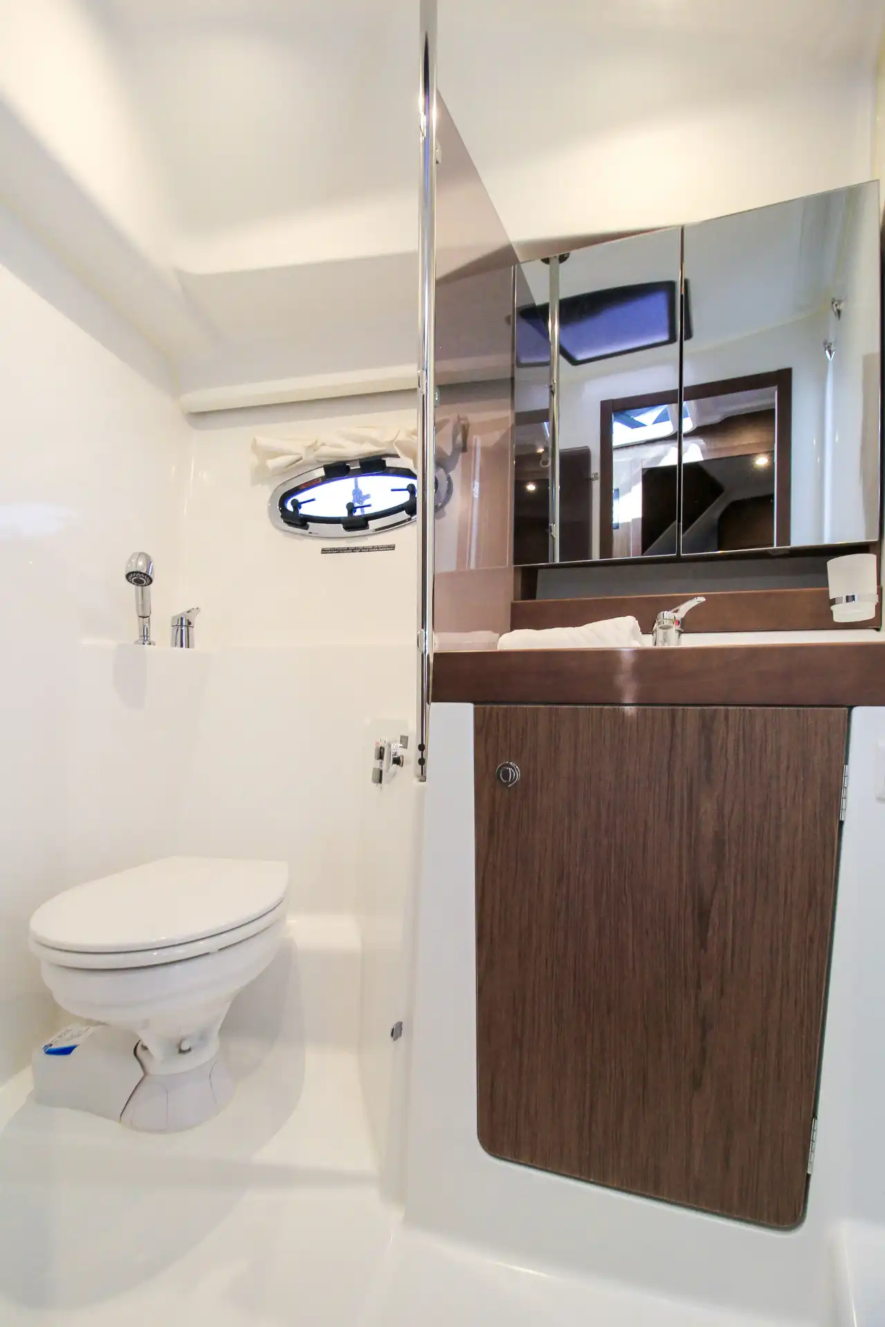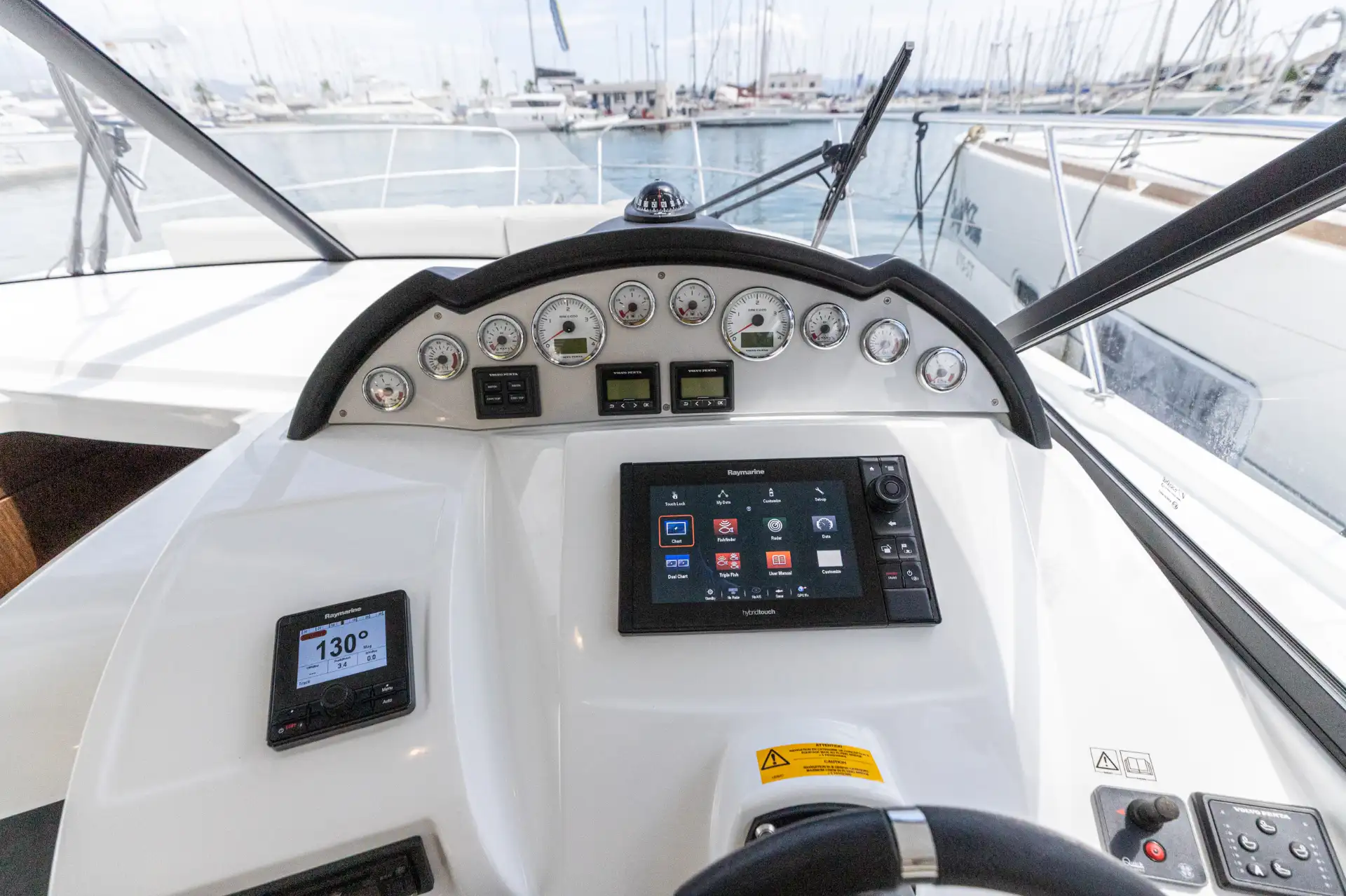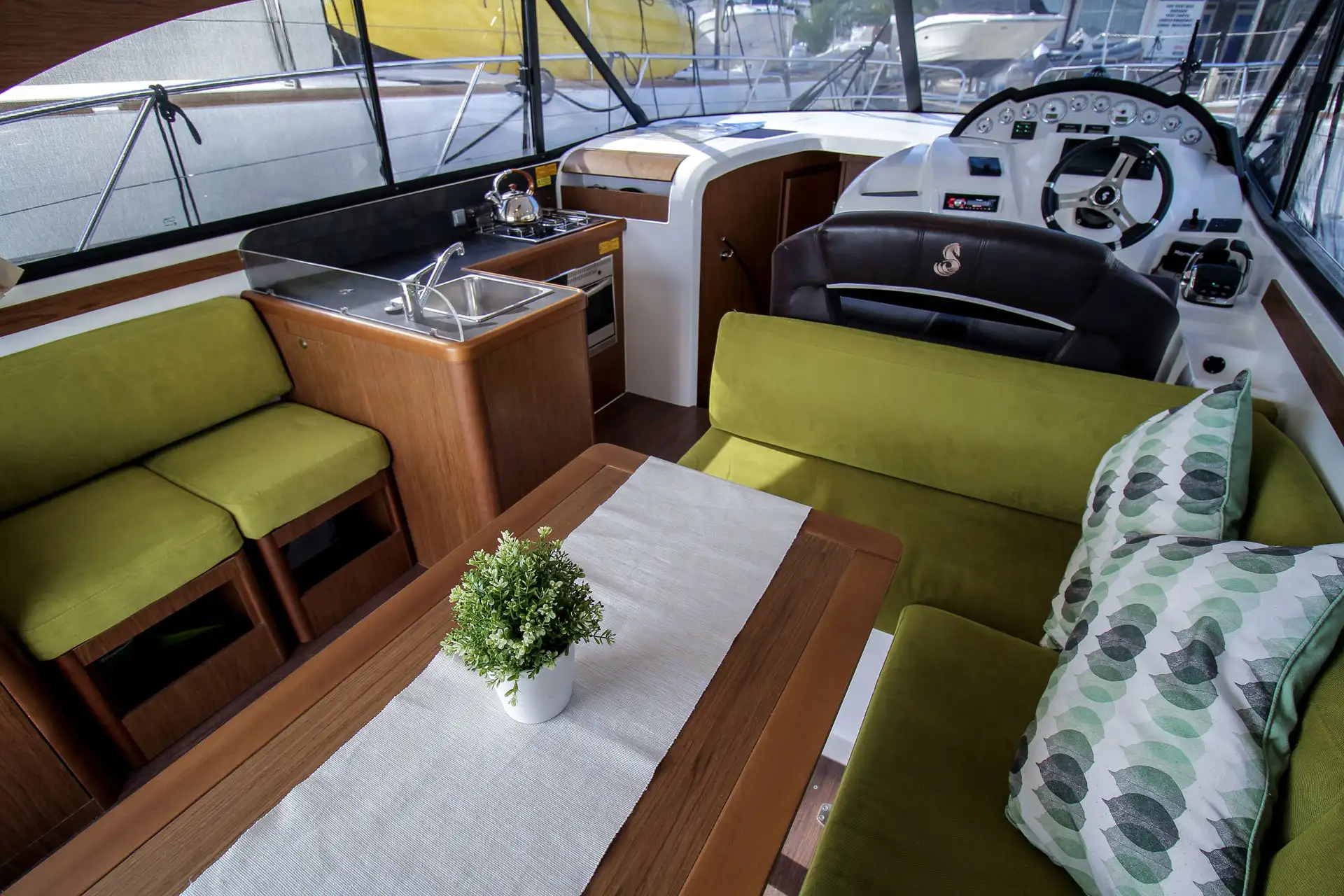 Die voll ausgestattete Pantry, ein leistungsstarker Generator und eine Klimaanlage sorgen für ein wohnliches Ambiente. Mit Bug- und Heckstrahlruder kann der Skipper stressfrei und unbesorgt manövrieren, da die Motoryacht äußerst präzise reagiert, ein Beweis für das perfekte Bootsdesign.