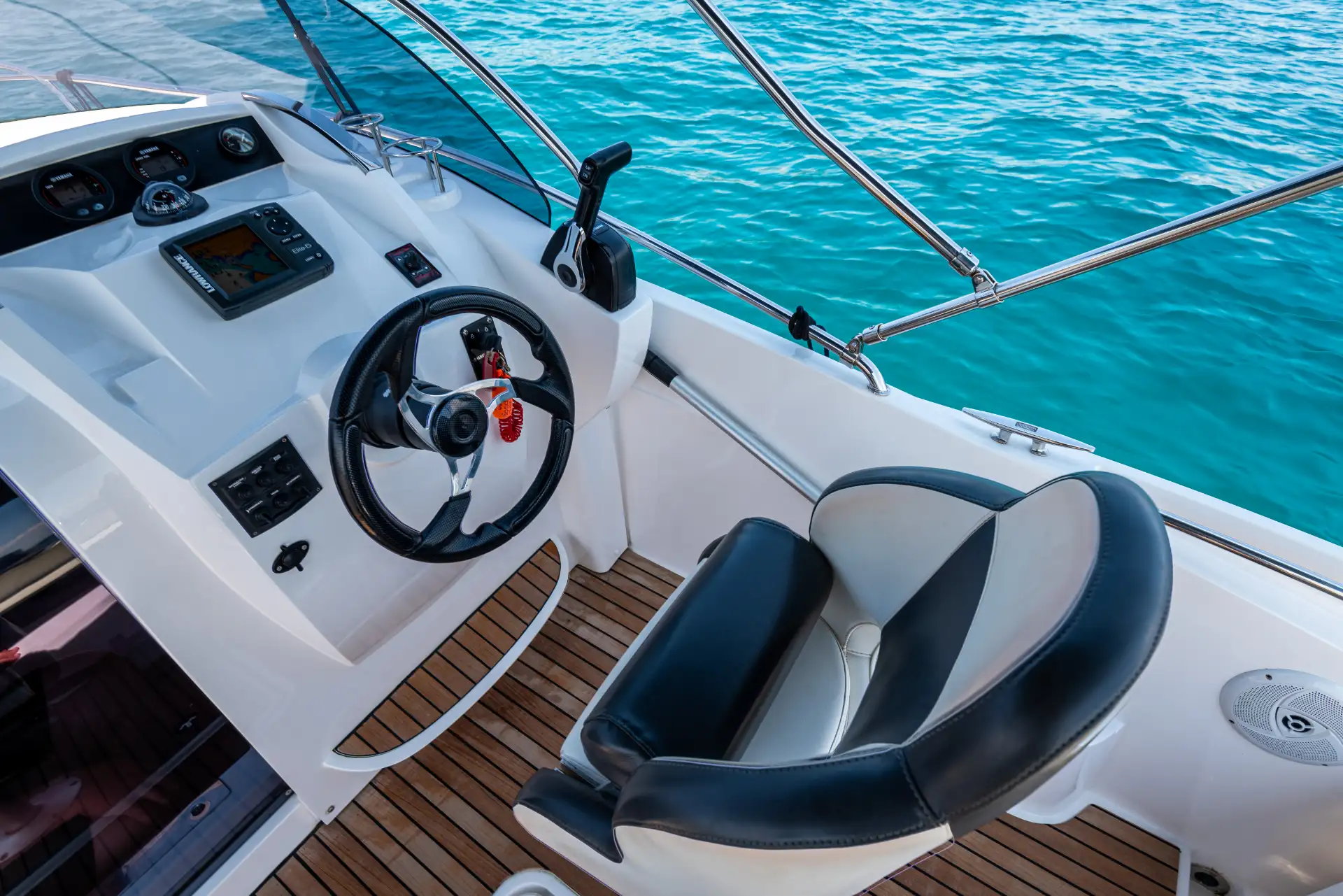 Das gemütliches Cockpit mit zwei drehbaren Schalensitzen und Rücksitzbank, die sich leicht zur Sonnenliege umklappen lasst, bietet Platz für gesellige Stunden auf dem Wasser.