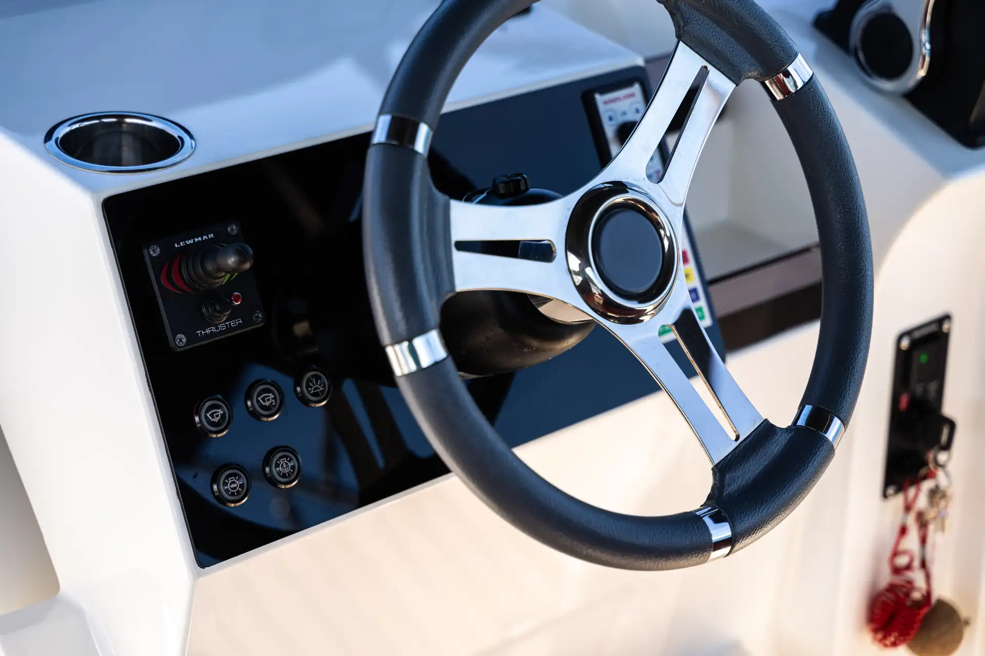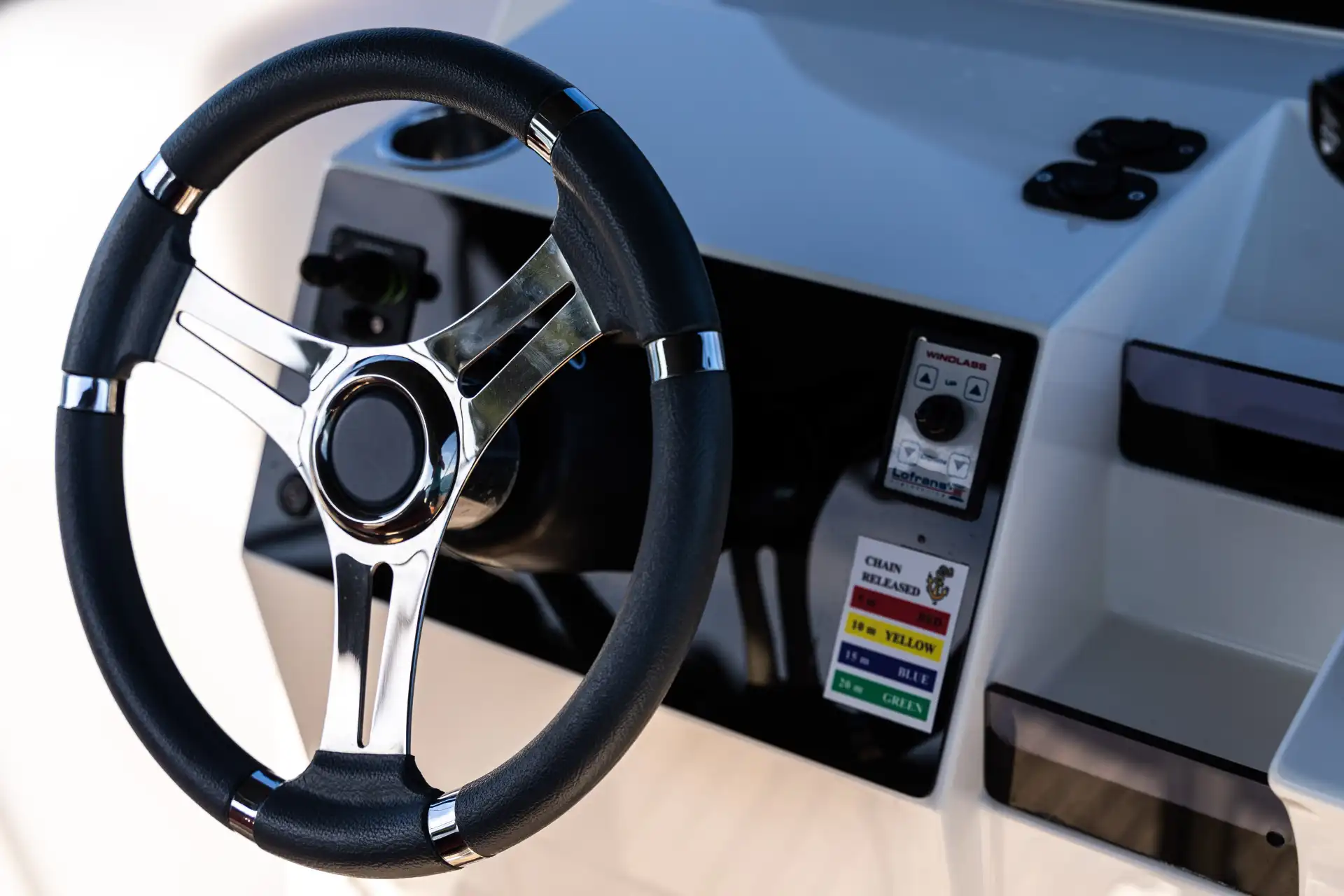 Bugstrahlruder, elektrische Ankerwinde, Landanschluss 220V, Batterie, Batterieladegerät, Batterie-Hauptschalter, Anker, zweiter Anker, Ankerkasten