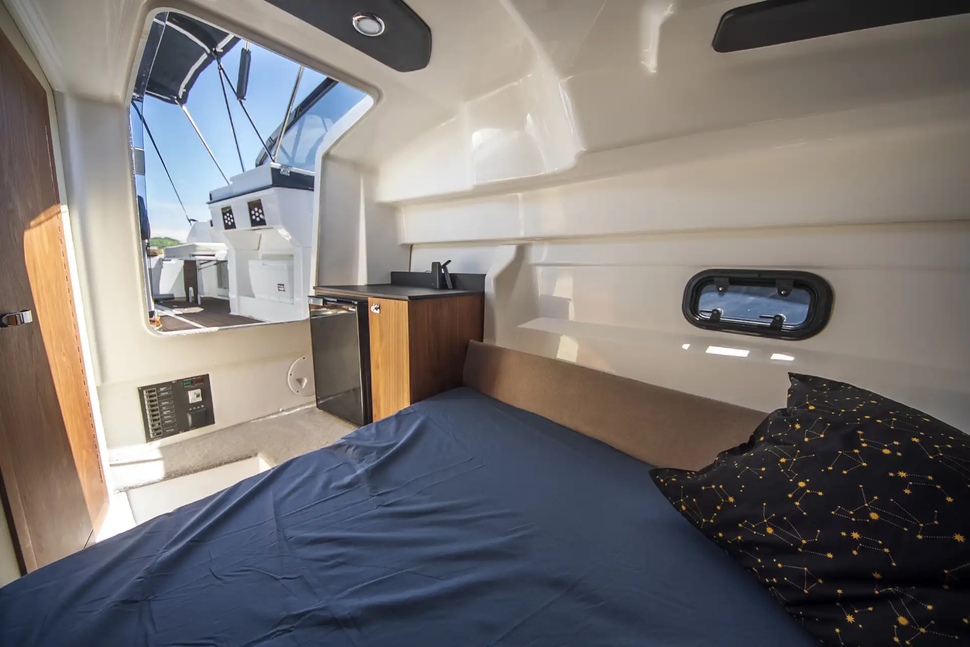 Wo sonst hat man auf knapp siebeneinhalb Metern Boot eine vollwertige Pantry, ein abgetrenntes WC und eine Schlafkoje für zwei Personen?