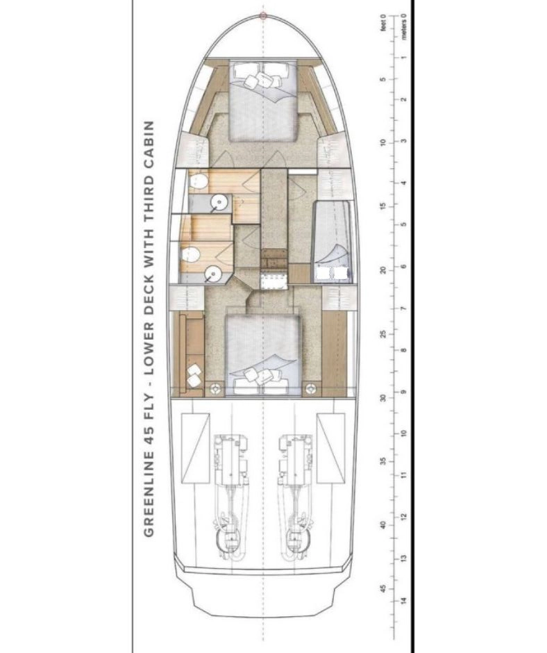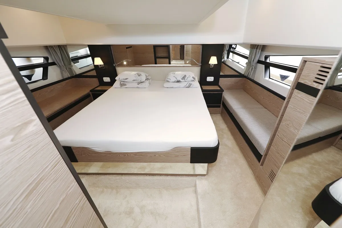 An Bord der Greenline 45 Fly – Pepper erwarten Sie drei geräumige Kabinen mit luxuriöser Ausstattung und zwei komfortable Badezimmer, die Platz für bis zu acht Gäste bieten. Die lichtdurchflutete Inneneinrichtung und die erstklassige Ausstattung schaffen ein Ambiente, das Eleganz und Gemütlichkeit in einzigartiger Harmonie vereint. Genießen Sie die absolute Entspannung auf der großzügigen Flybridge, die mit komfortablen Loungemöbeln ausgestattet ist – der perfekte Ort für Ihren morgendlichen Kaffee mit Blick auf die atemberaubende Küste oder für gesellige Abende unter dem sternenklaren Himmel.